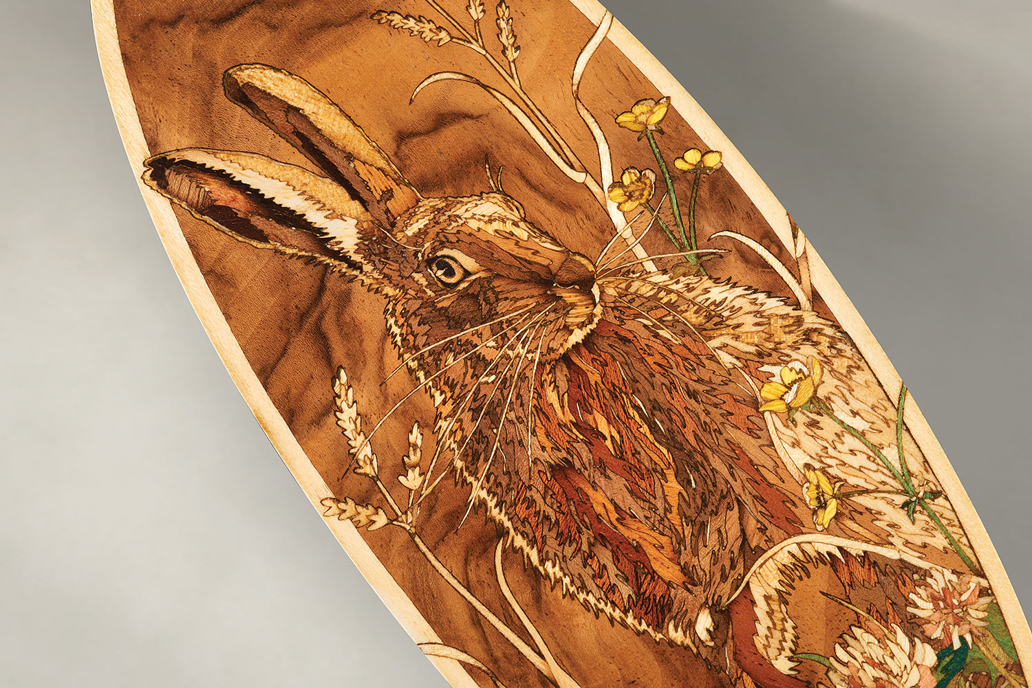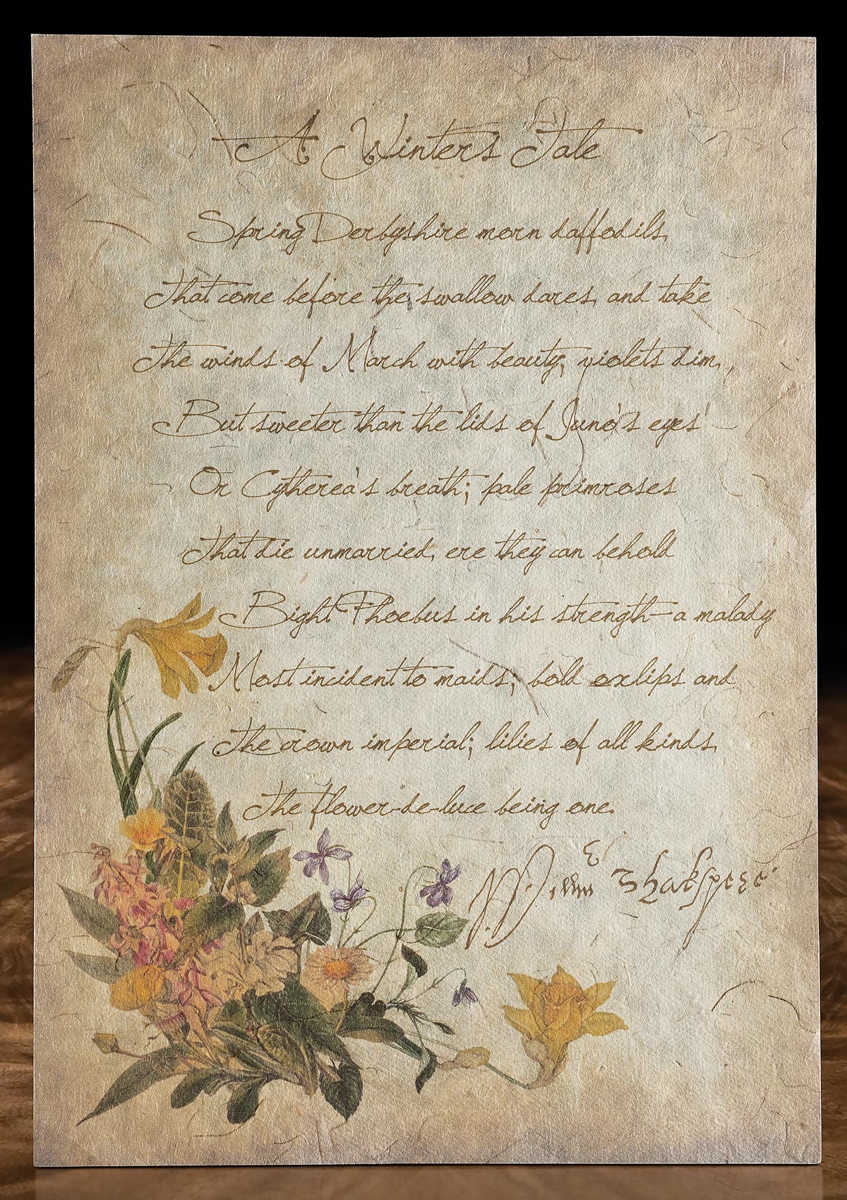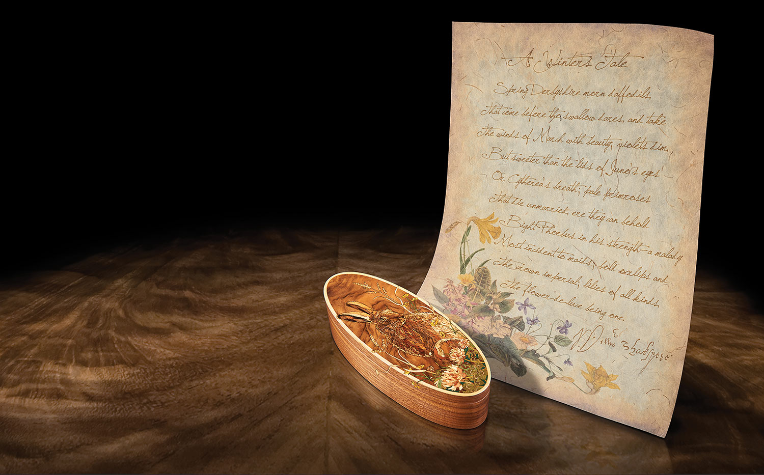 The beautiful box encompasses ideas taken from the play’s theme of changing seasons and also from the symbol of the March hare, representing the goddess of regeneration. Shakespeare immortalised the arrival and passing of one particular spring, whilst the March hare is the goddess of regeneration for each year.