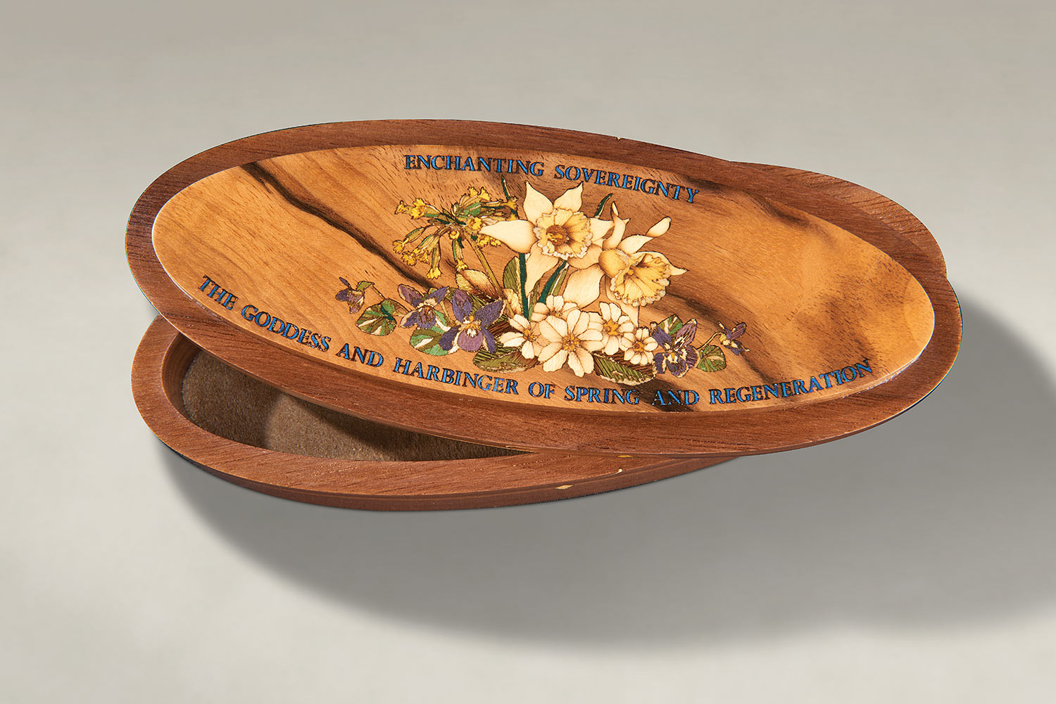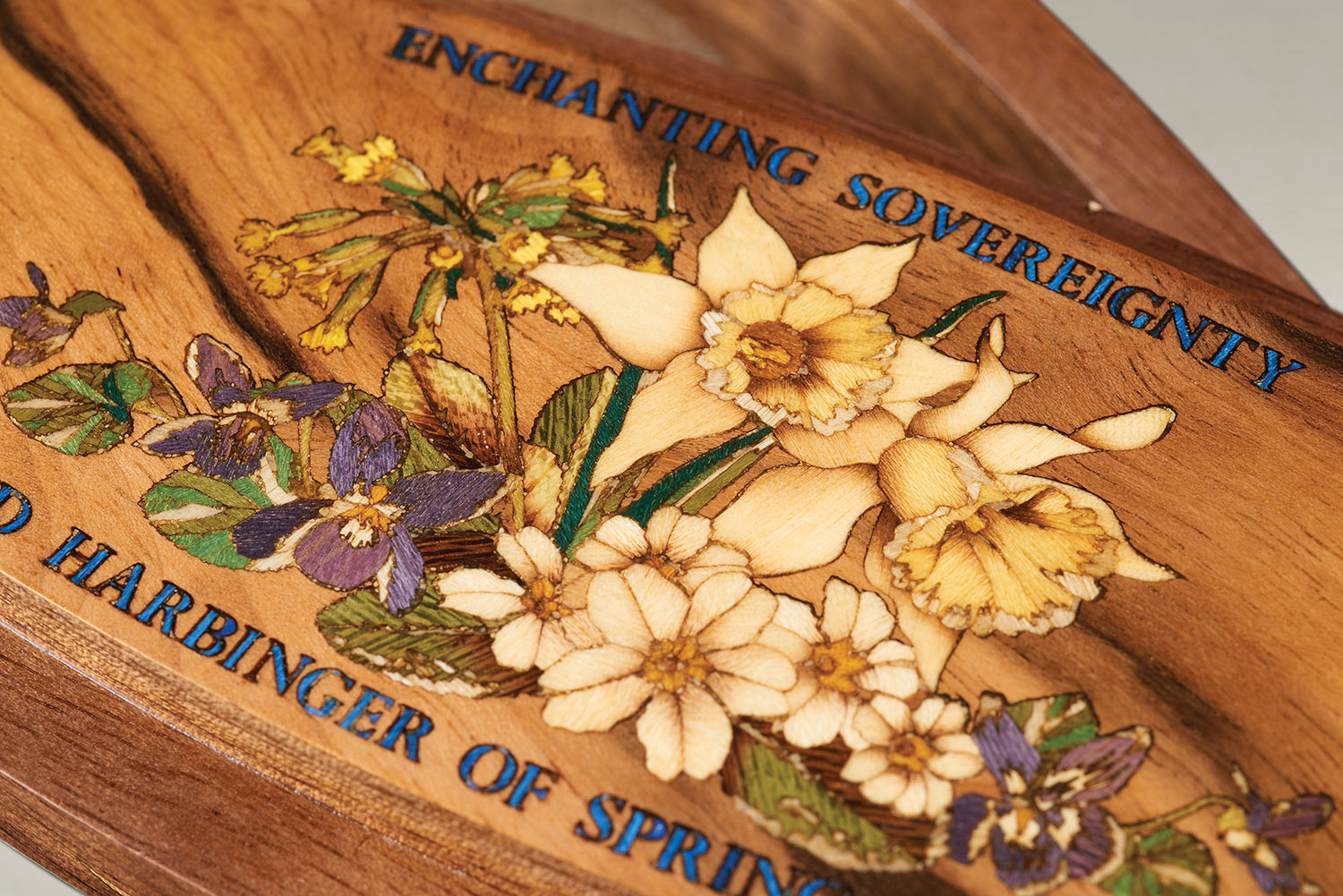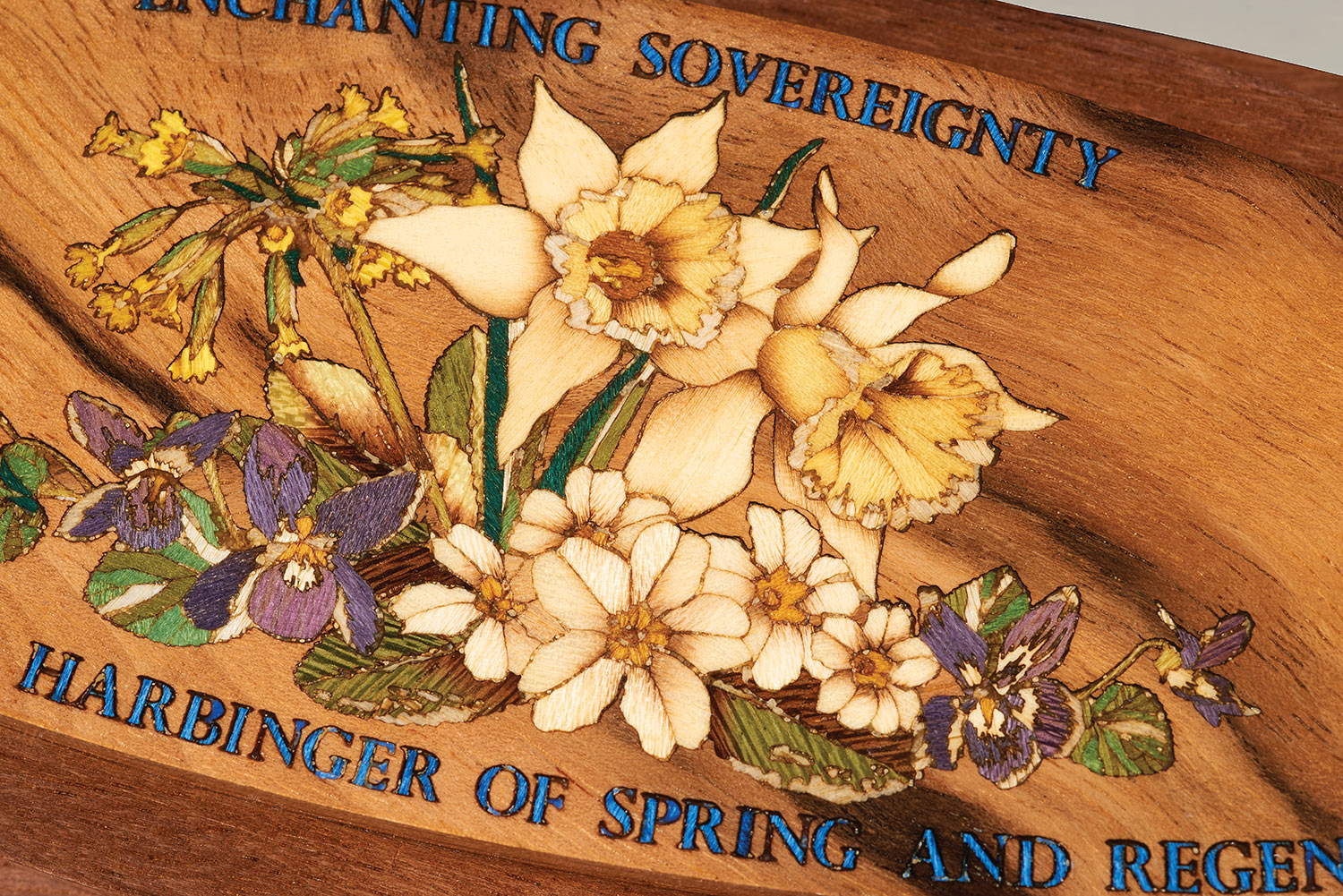 Shakespeare's The Winter's Tale and the notion of a harbinger of spring are perfect partners. They are themes that blend harmoniously and have inspired a micro-marquetry design on a tiny trinket box.