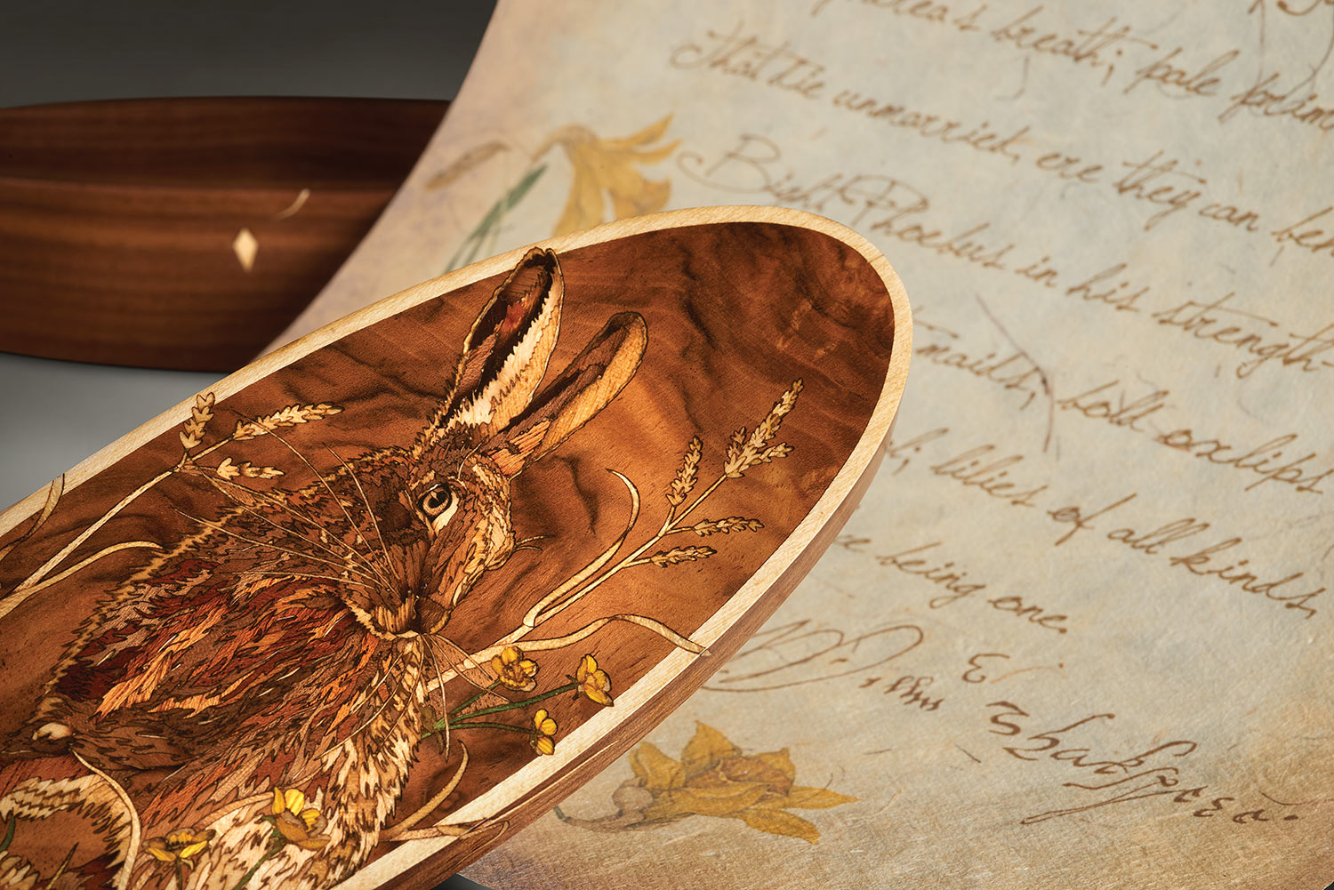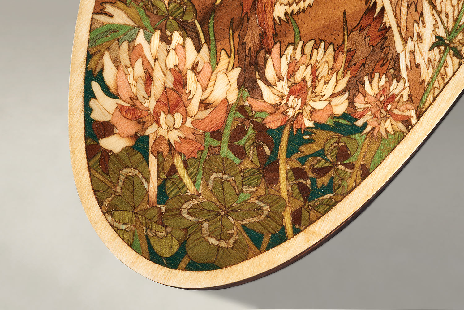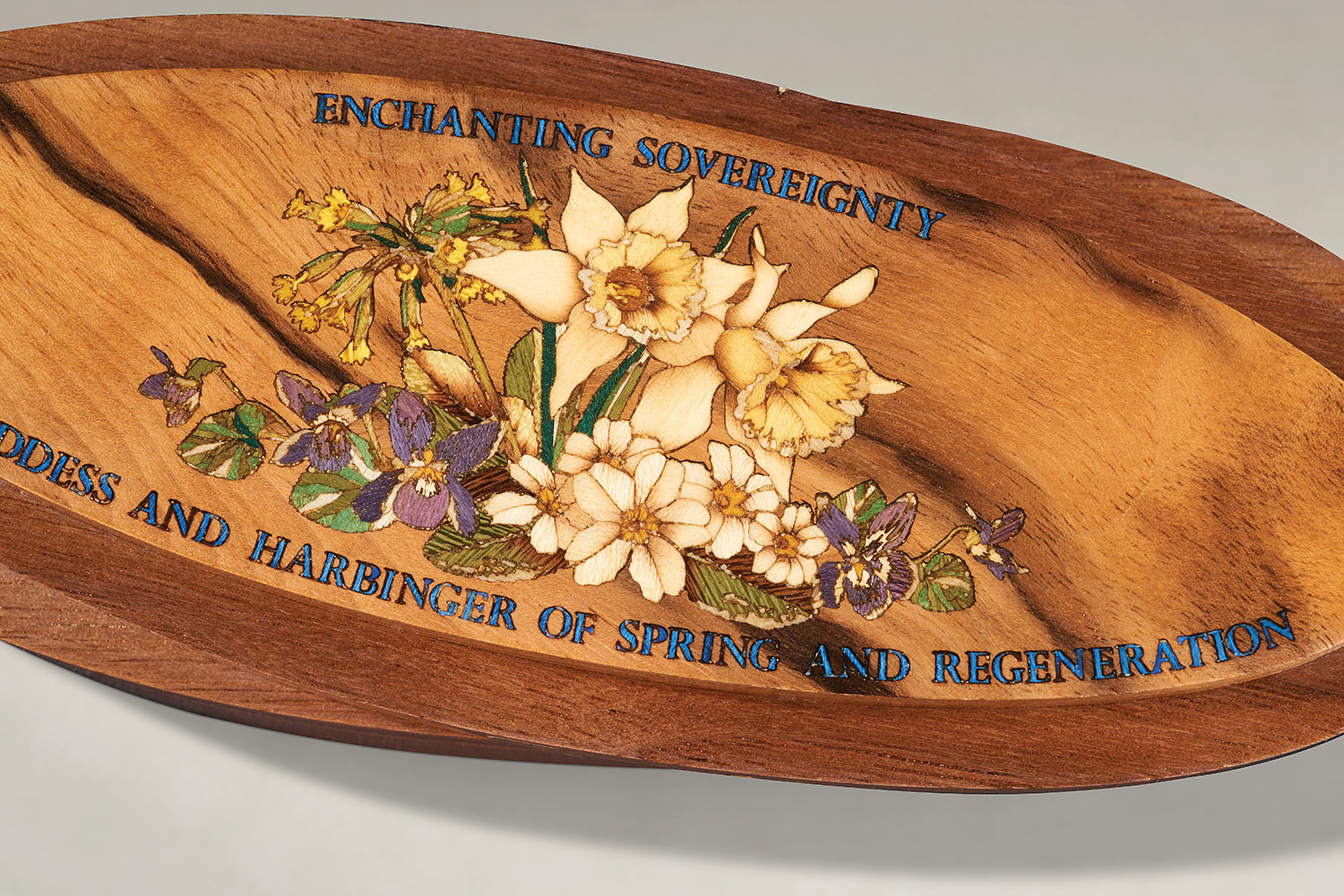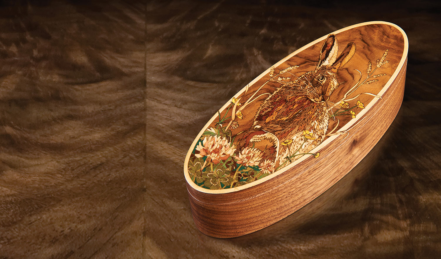 Shakespeare's The Winter's Tale and the notion of a harbinger of spring are perfect partners. They are themes that blend harmoniously and have inspired a micro-marquetry design on a tiny trinket box.