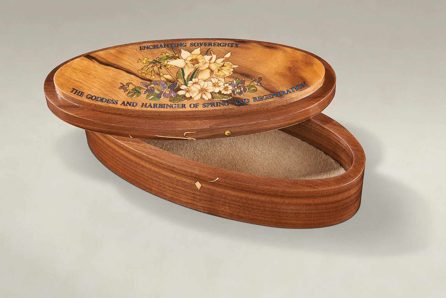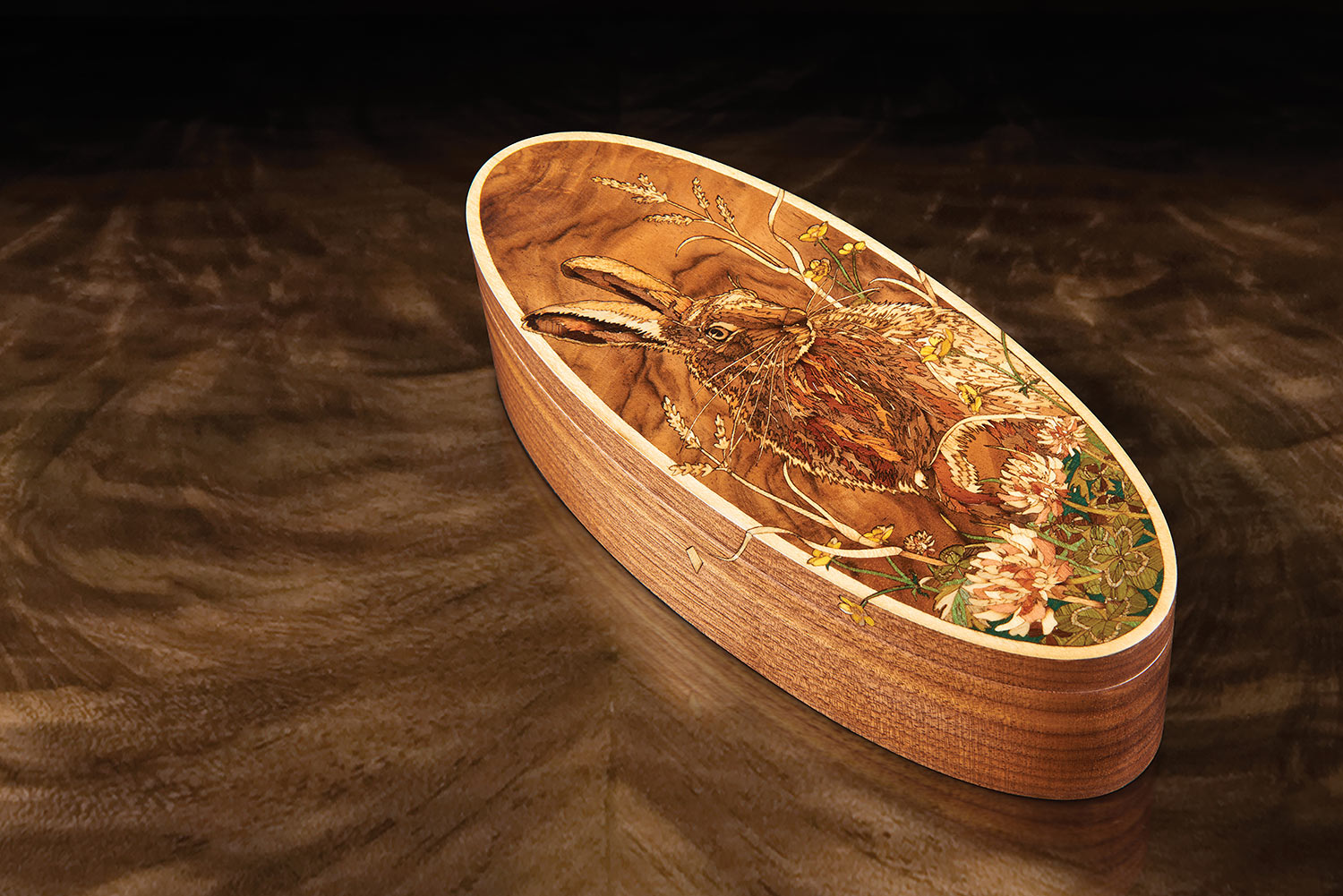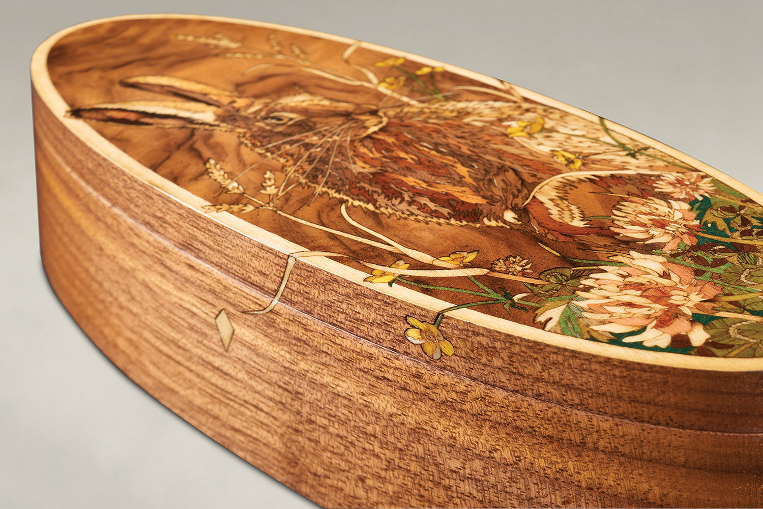 This walnut box is petite and tactile being only 6.25 inches long and 2.25 inches wide. The marquetry design is inlayed into fine butt walnut and is made of 100 pieces of timber per square inch. The exterior of the lid depicts the harbinger alert amidst a wild flower meadow and the inside of the lid details each flower of Shakespeare's monologue of a winter's tale, as one spring flower gives way through the passing of time to another until summer arrives.