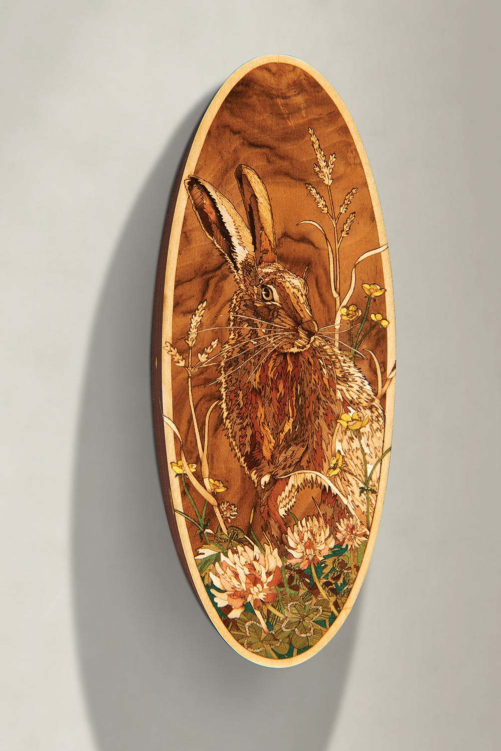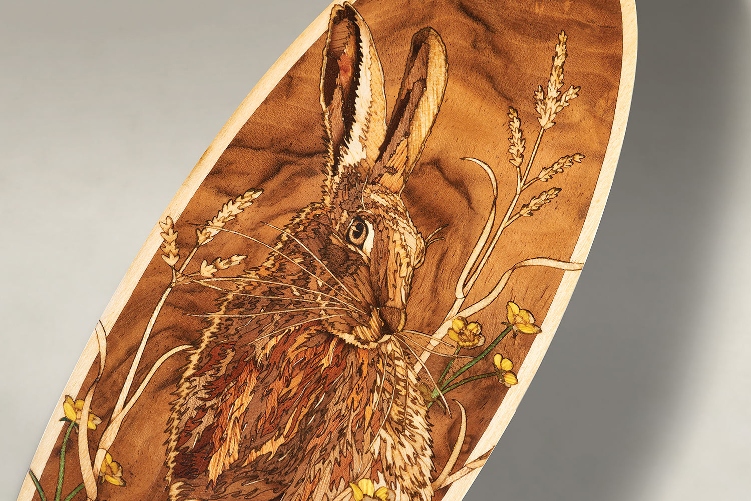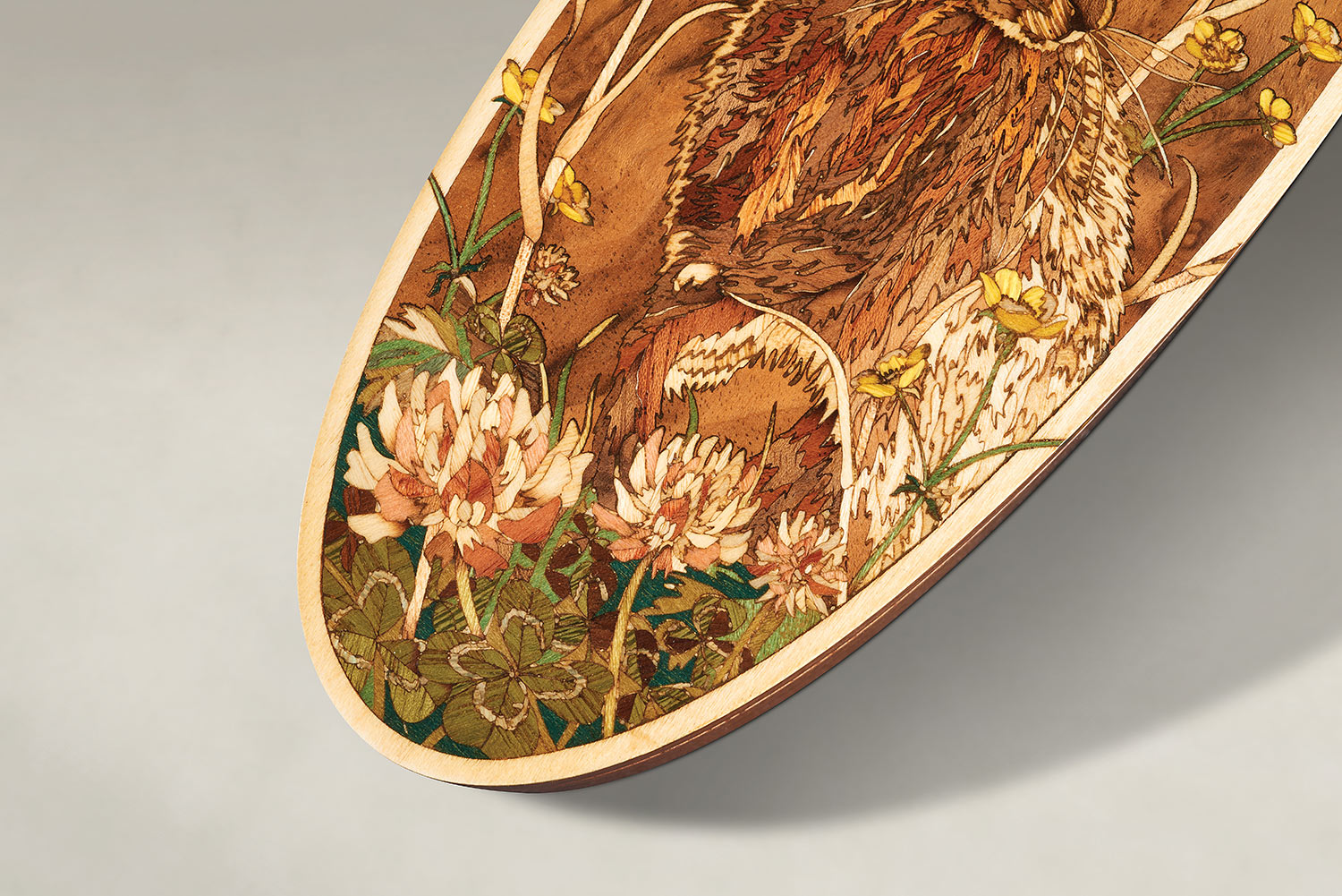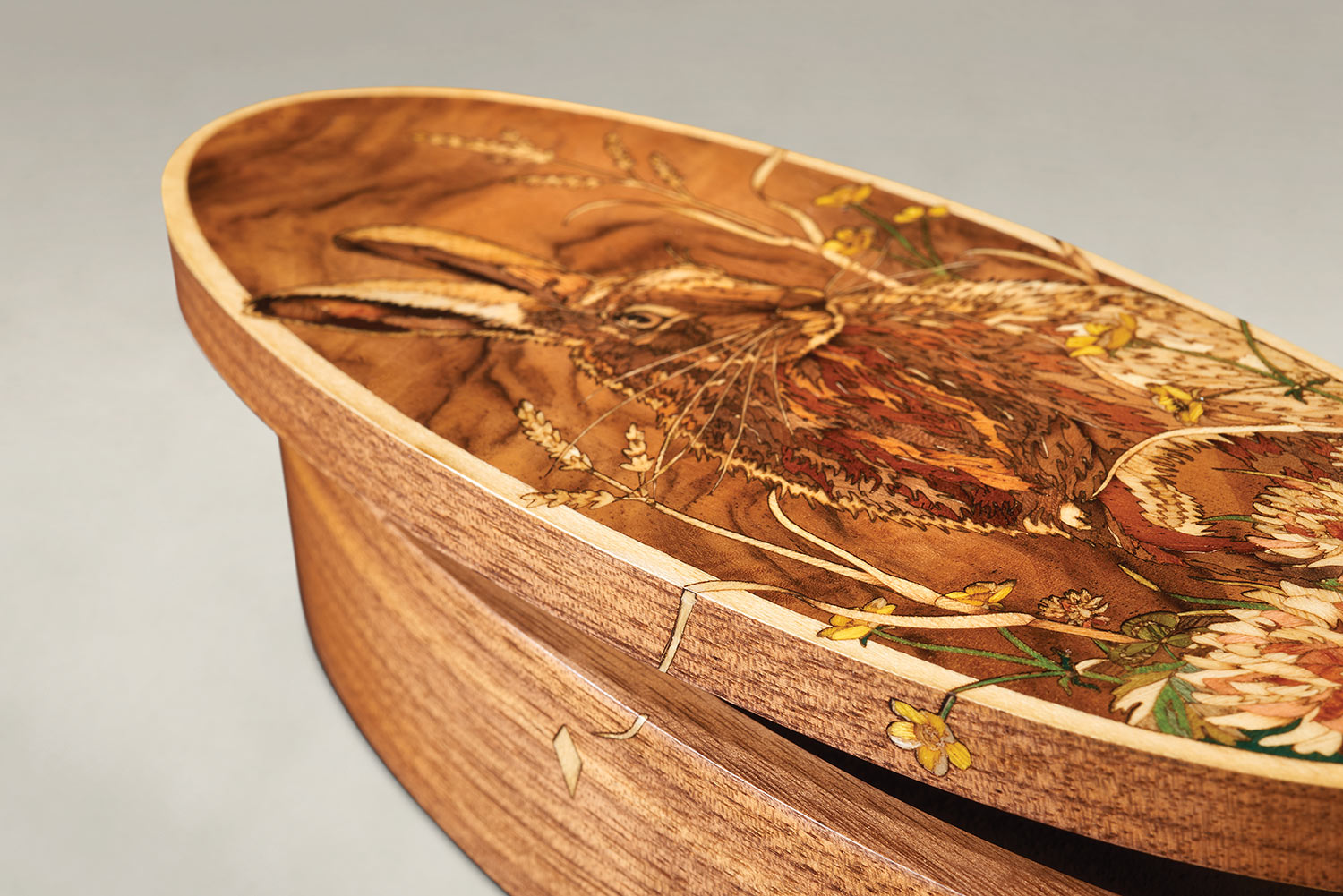 This walnut box is petite and tactile being only 6.25 inches long and 2.25 inches wide. The marquetry design is inlayed into fine butt walnut and is made of 100 pieces of timber per square inch. The exterior of the lid depicts the harbinger alert amidst a wild flower meadow and the inside of the lid details each flower of Shakespeare's monologue of a winter's tale, as one spring flower gives way through the passing of time to another until summer arrives.