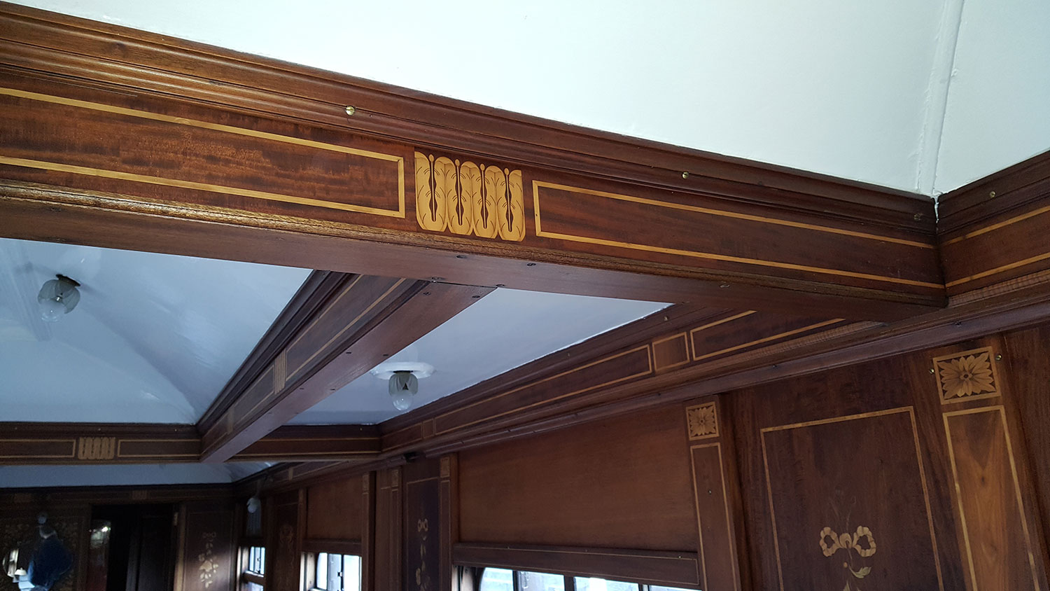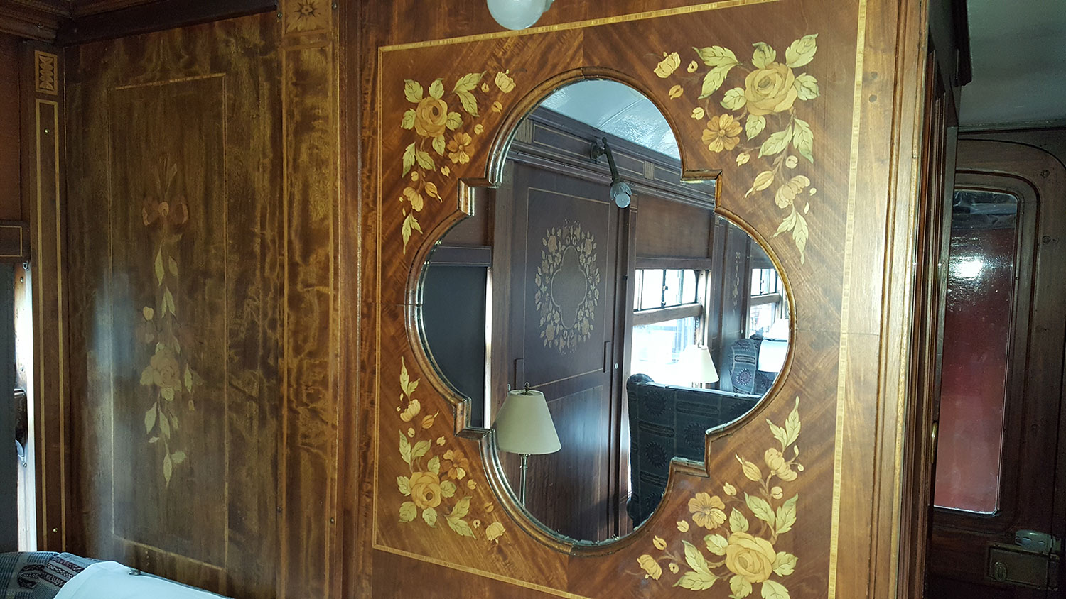 Heritage rolling stock Theodora, built in 1926, is beautifully decorated with floral marquetry panels throughout, but recently a flood has damaged several panels.