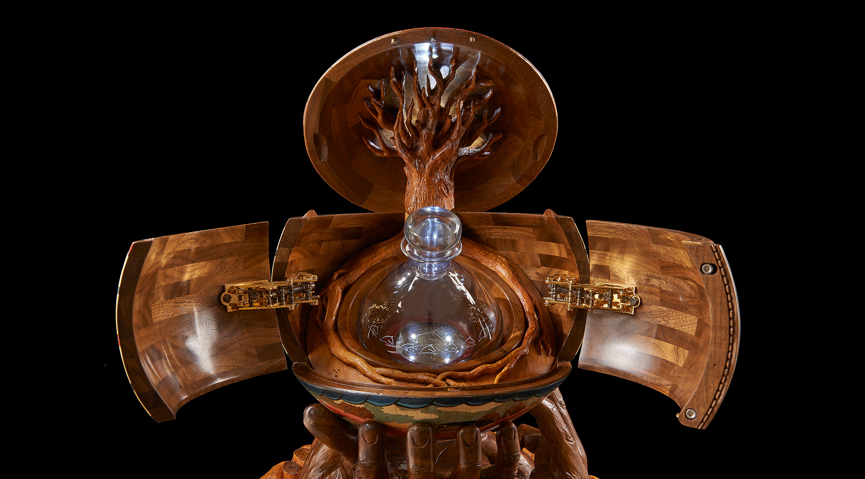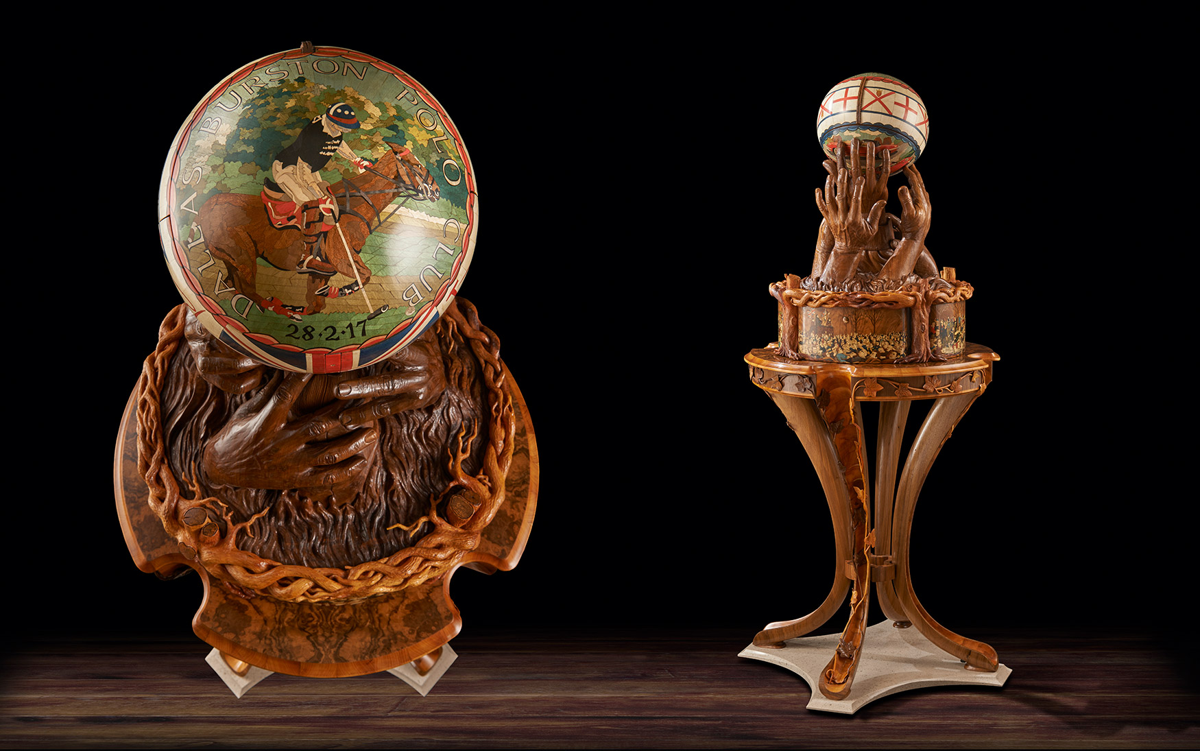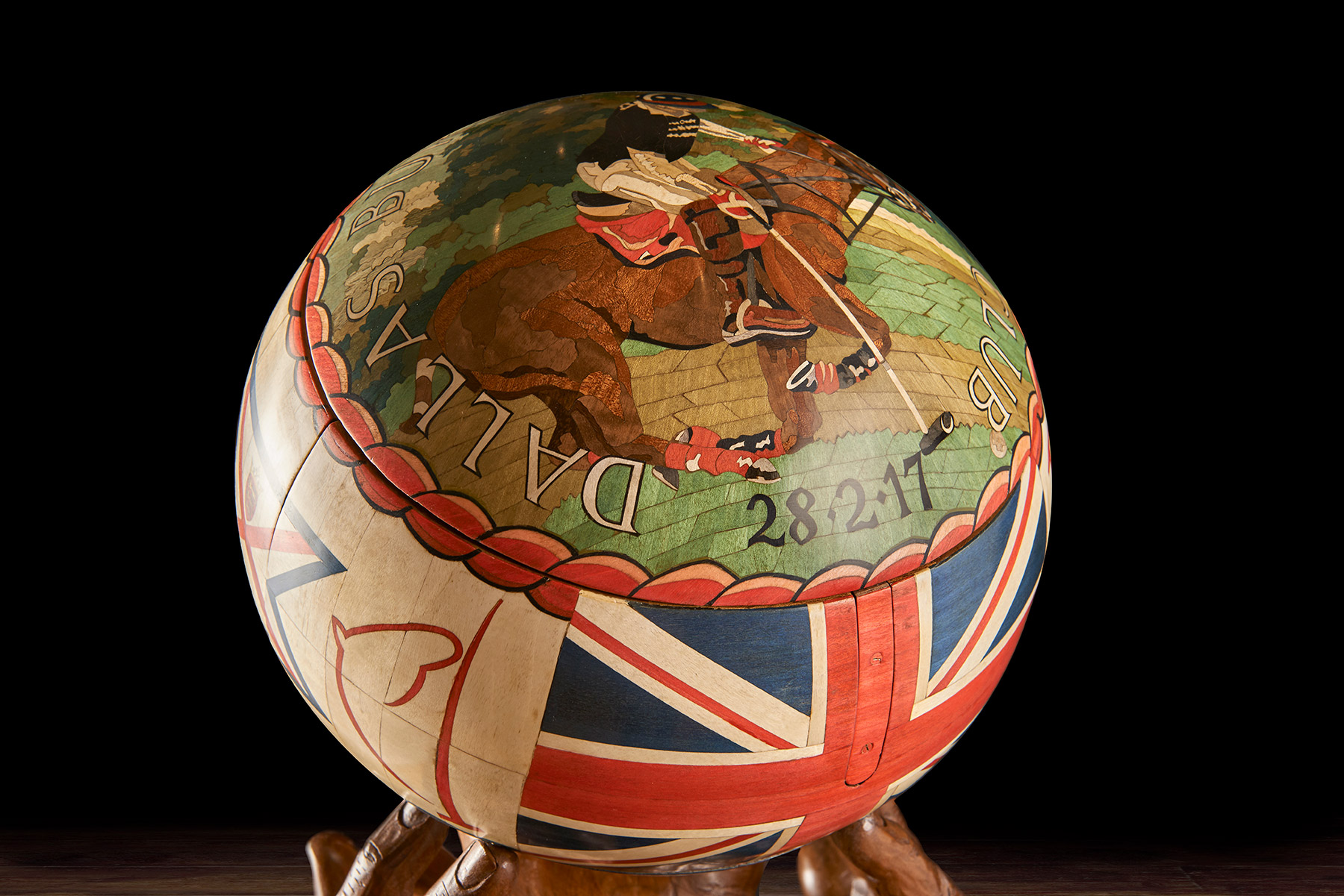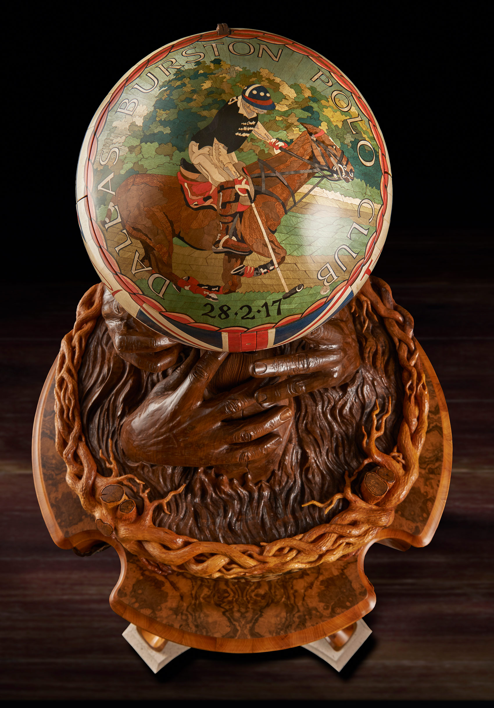 One of the most technically challenging aspects was to make the ball. It took six weeks and involved, as Nigel said, ‘capturing perfectly not only its shape but also its handstitched details, bumps and dents.’ The original ball was cast in bronze resin and the cast used as a pattern over which vibrantly coloured marquetry images could be drawn, designed, spaced and created. Next a hollow walnut ball, identical to the bronze resin cast, was created from 120 segments of walnut, each walnut layer cut in decreasing size to create the perfect curve. This was then lathe-turned and carved with the dents and bumps of the original. The marquetry, designed on the resin cast, was transferred to the walnut ball. The whole was cut in three and the three parts micro-engineered with hand-made knuckle hinges, levers and pistons so that, at the push of a secret button concealed in the marquetry, it would open to reveal a hand- blown English crystal decanter set on an up-lit carved walnut cushion. The interior lid of the sphere is inlaid with a ‘yew tree of life’, delicately carved in yew wood to symbolise tradition, strength and success.