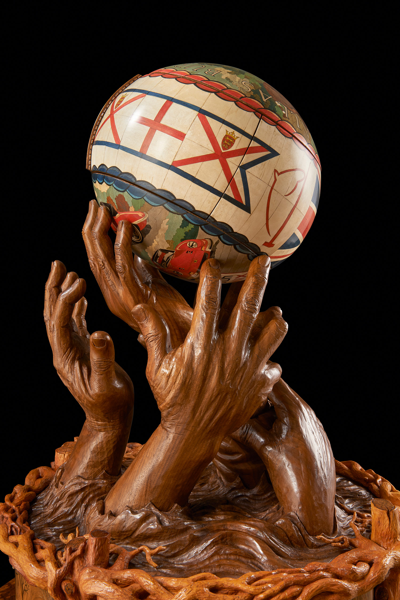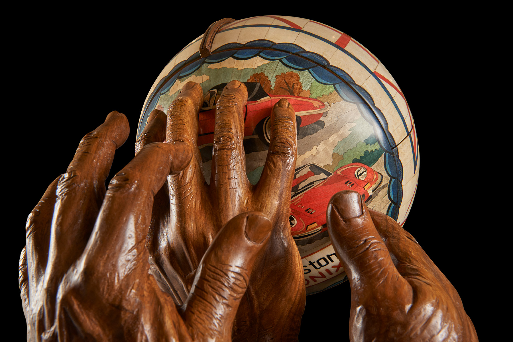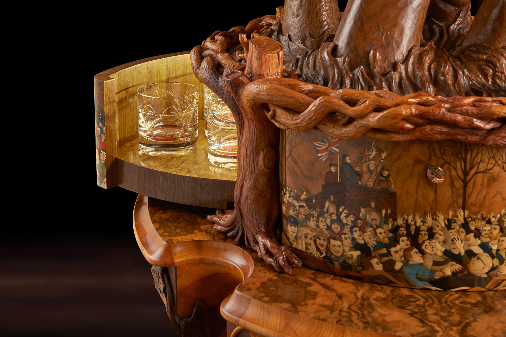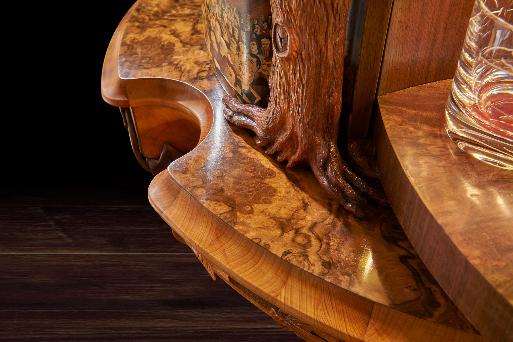 One of the most technically challenging aspects was to make the ball. It took six weeks and involved, as Nigel said, ‘capturing perfectly not only its shape but also its handstitched details, bumps and dents.’ The original ball was cast in bronze resin and the cast used as a pattern over which vibrantly coloured marquetry images could be drawn, designed, spaced and created. Next a hollow walnut ball, identical to the bronze resin cast, was created from 120 segments of walnut, each walnut layer cut in decreasing size to create the perfect curve. This was then lathe-turned and carved with the dents and bumps of the original. The marquetry, designed on the resin cast, was transferred to the walnut ball. The whole was cut in three and the three parts micro-engineered with hand-made knuckle hinges, levers and pistons so that, at the push of a secret button concealed in the marquetry, it would open to reveal a hand- blown English crystal decanter set on an up-lit carved walnut cushion. The interior lid of the sphere is inlaid with a ‘yew tree of life’, delicately carved in yew wood to symbolise tradition, strength and success.