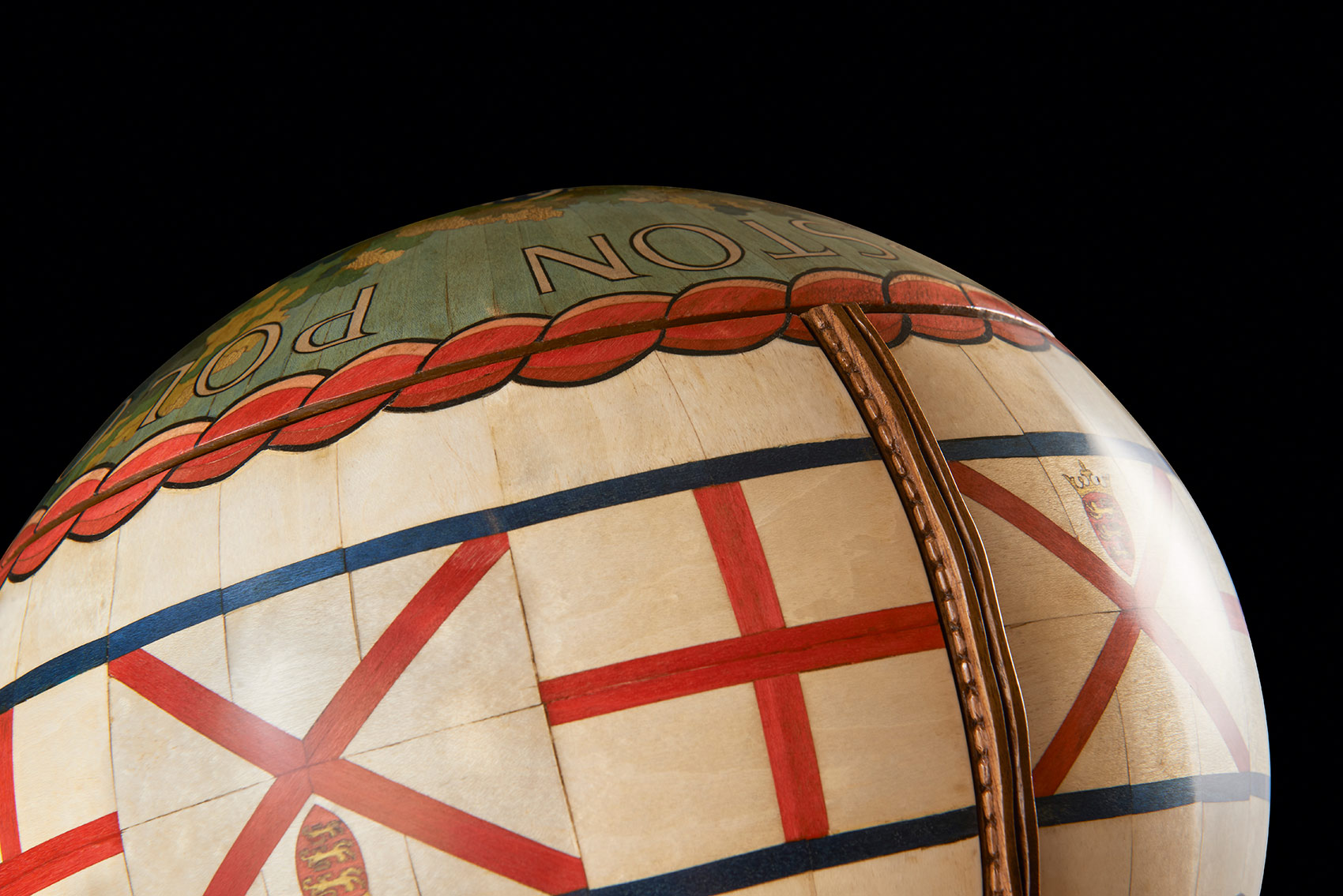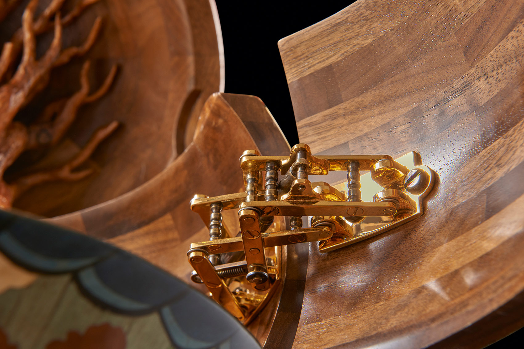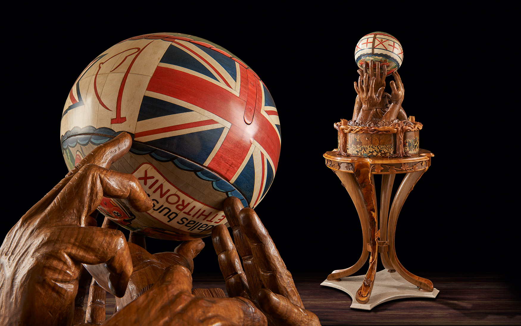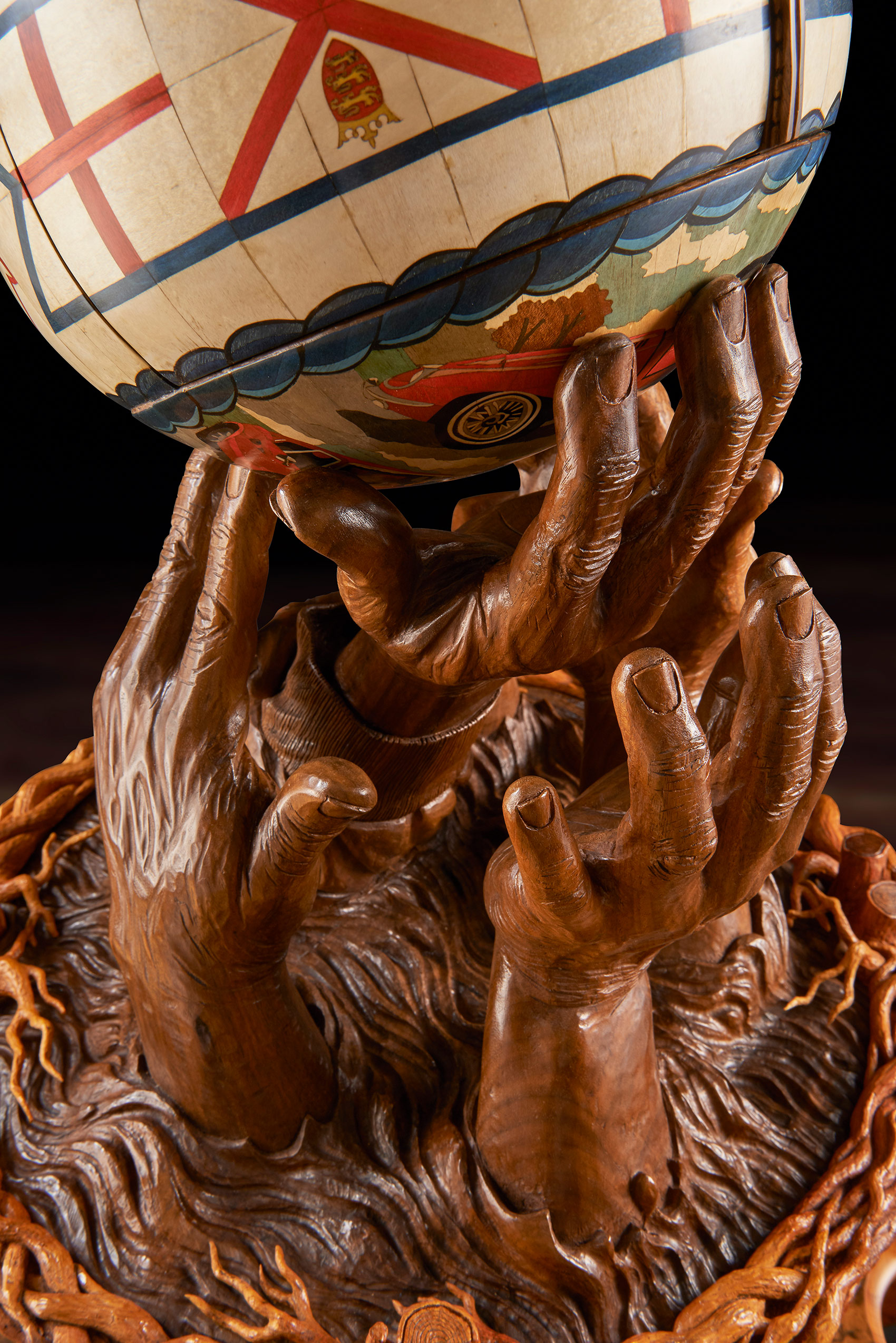 One of the most technically challenging aspects was to make the ball. It took six weeks and involved, as Nigel said, ‘capturing perfectly not only its shape but also its handstitched details, bumps and dents.’ The original ball was cast in bronze resin and the cast used as a pattern over which vibrantly coloured marquetry images could be drawn, designed, spaced and created. Next a hollow walnut ball, identical to the bronze resin cast, was created from 120 segments of walnut, each walnut layer cut in decreasing size to create the perfect curve. This was then lathe-turned and carved with the dents and bumps of the original. The marquetry, designed on the resin cast, was transferred to the walnut ball. The whole was cut in three and the three parts micro-engineered with hand-made knuckle hinges, levers and pistons so that, at the push of a secret button concealed in the marquetry, it would open to reveal a hand- blown English crystal decanter set on an up-lit carved walnut cushion. The interior lid of the sphere is inlaid with a ‘yew tree of life’, delicately carved in yew wood to symbolise tradition, strength and success.