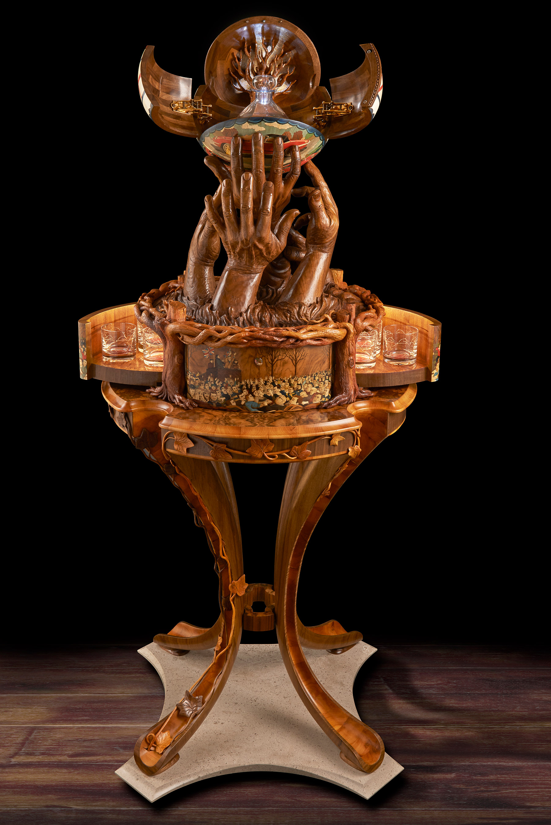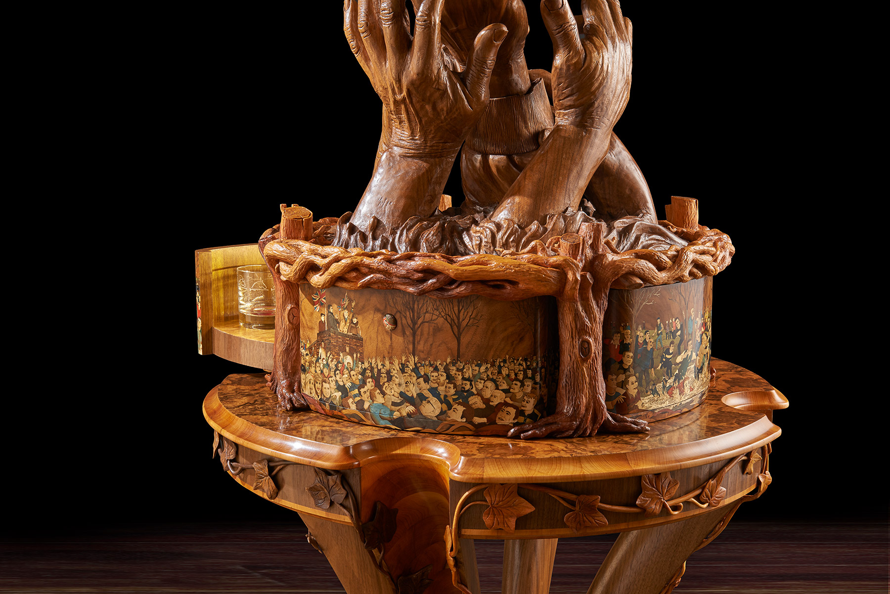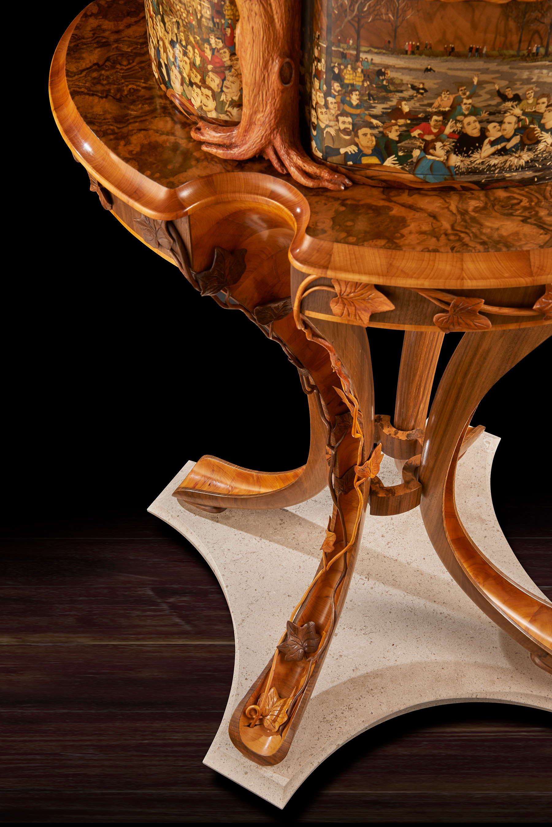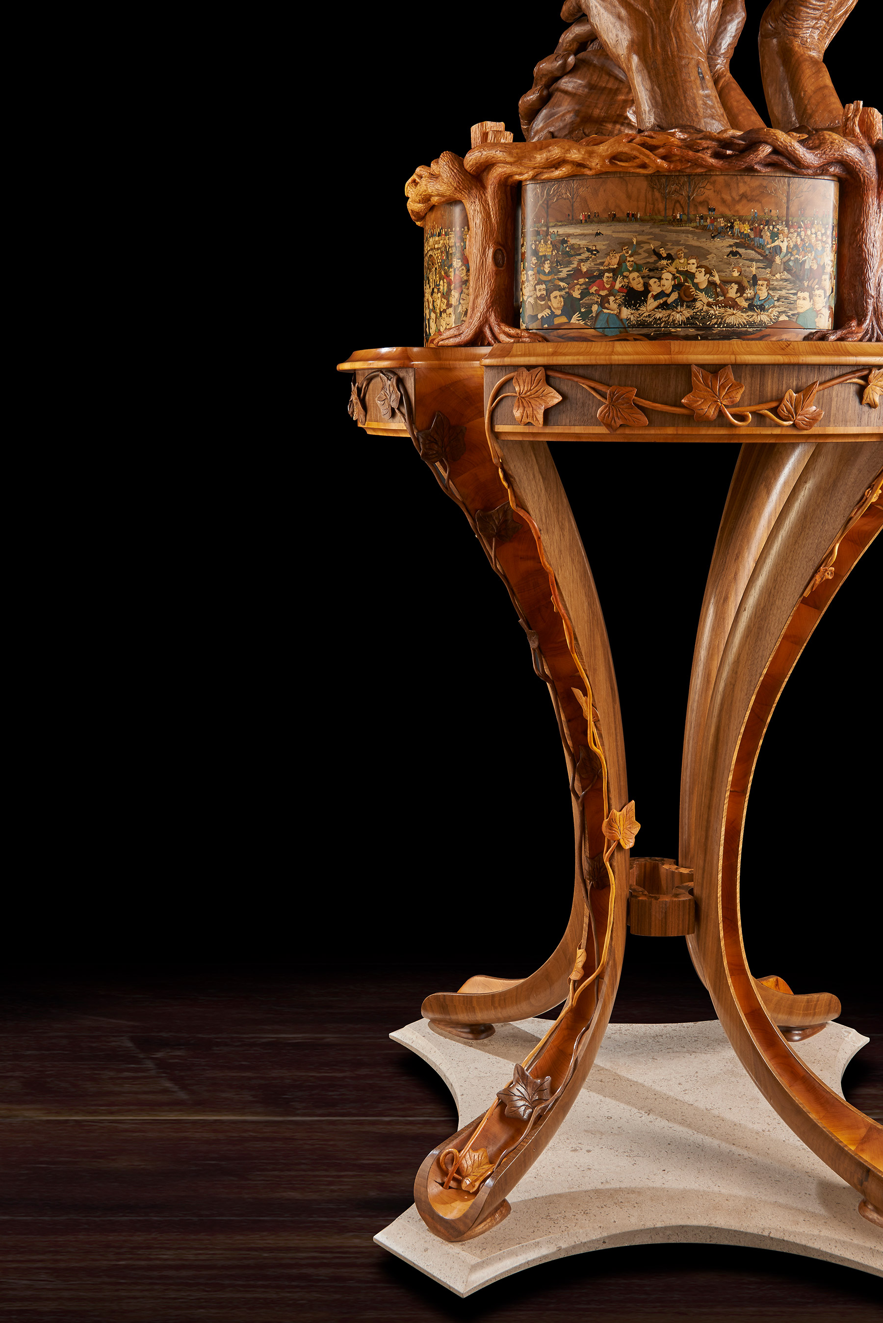 The memory box is also carved with a walnut tree and at the release of a concealed button, the sides open to reveal engraved crystal glasses. A further drawer, to keep safe mementos of the match, can be released with the press of a second secret button. The sculpture sits on a specially created burr walnut and yew wood table – on which it can rotate. The stand’s four delicate serpentine legs have been cleverly engineered to rest on the short grain of the wood – furniture legs usually rely for strength on the long grain cut. ‘We wanted to create that sense of wonder, to make the viewer question how on earth it worked. I was really trying to put the impossible into a piece and to encourage curiosity and interaction with it,’ said Nigel. Reflecting the time of year of the Royal Shrovetide game, the hand- carved, hollowed-out legs are decorated with climbing ivy that aligns with the walnut trees on the memory box.