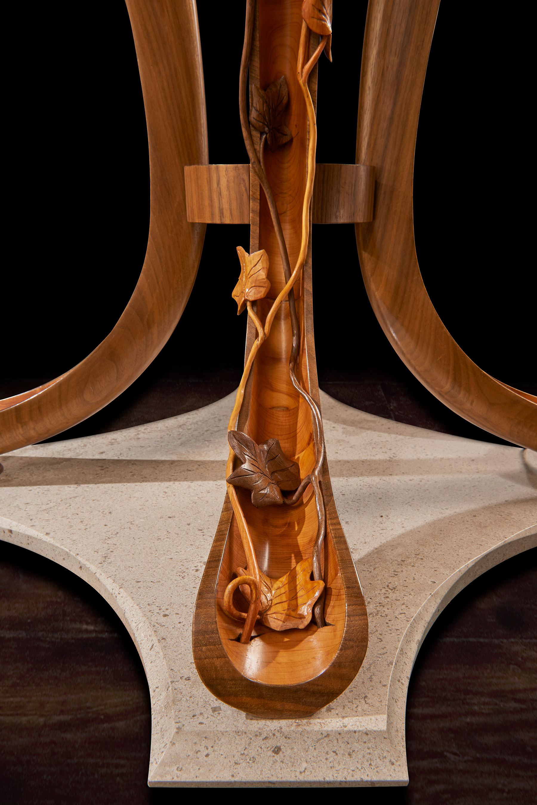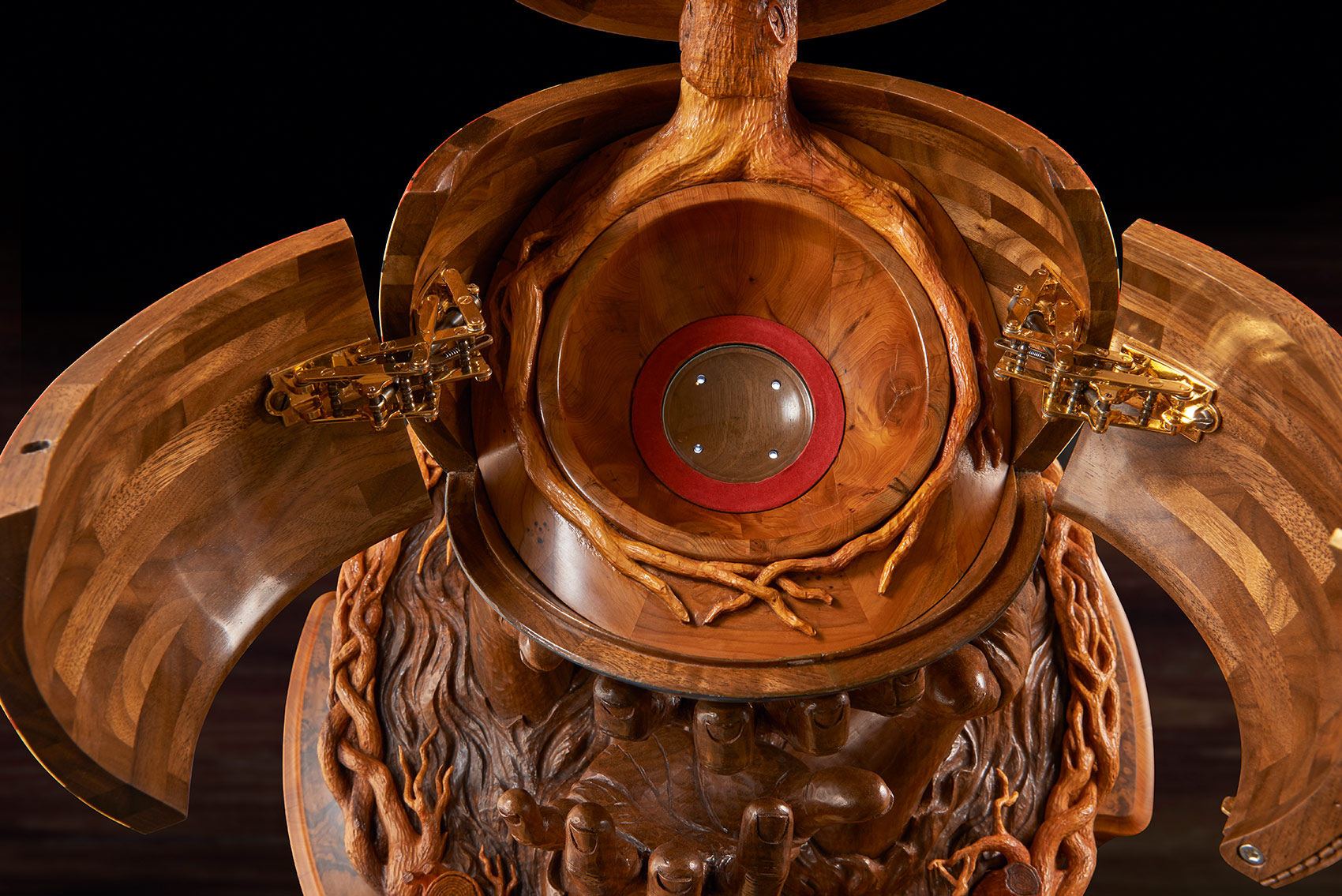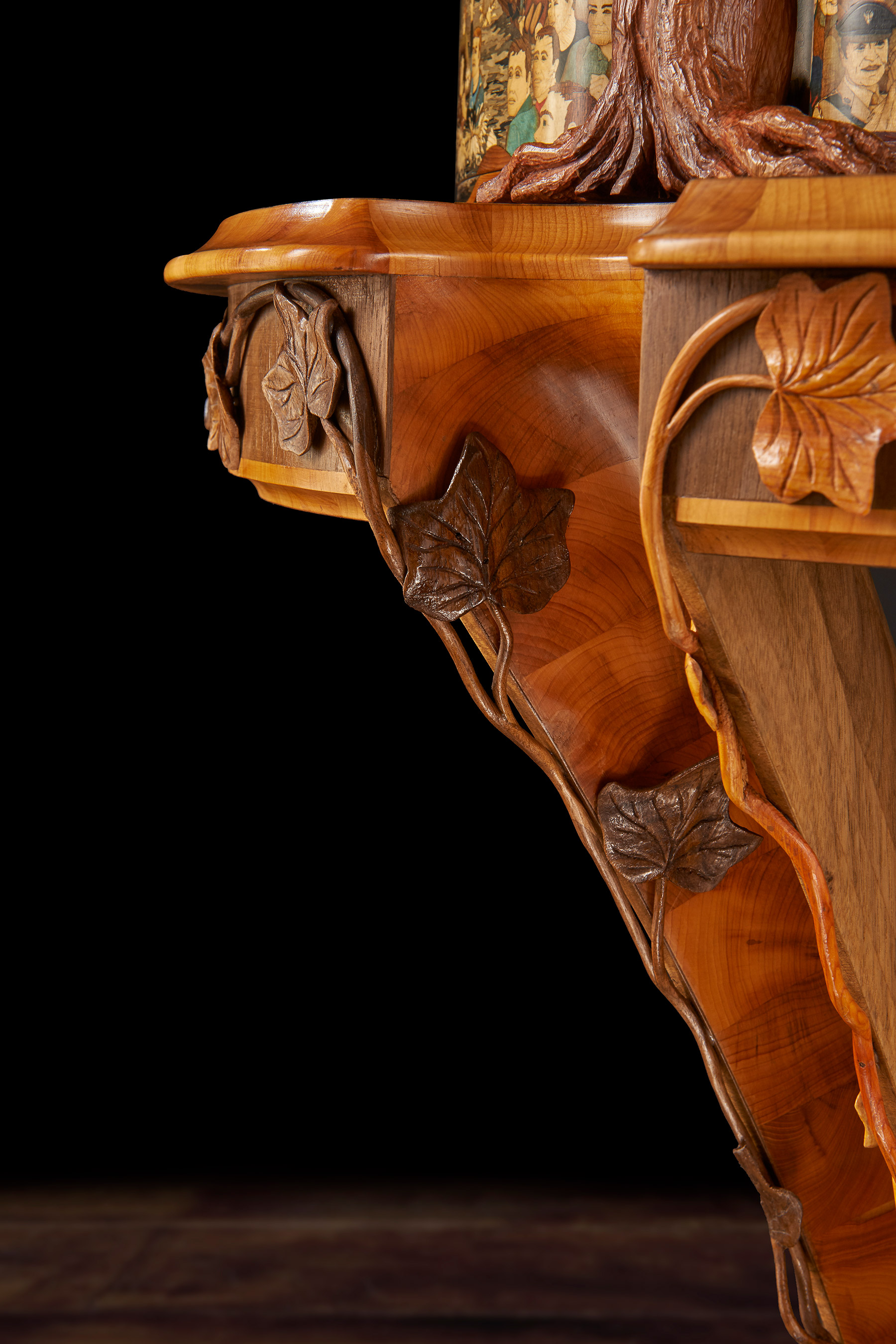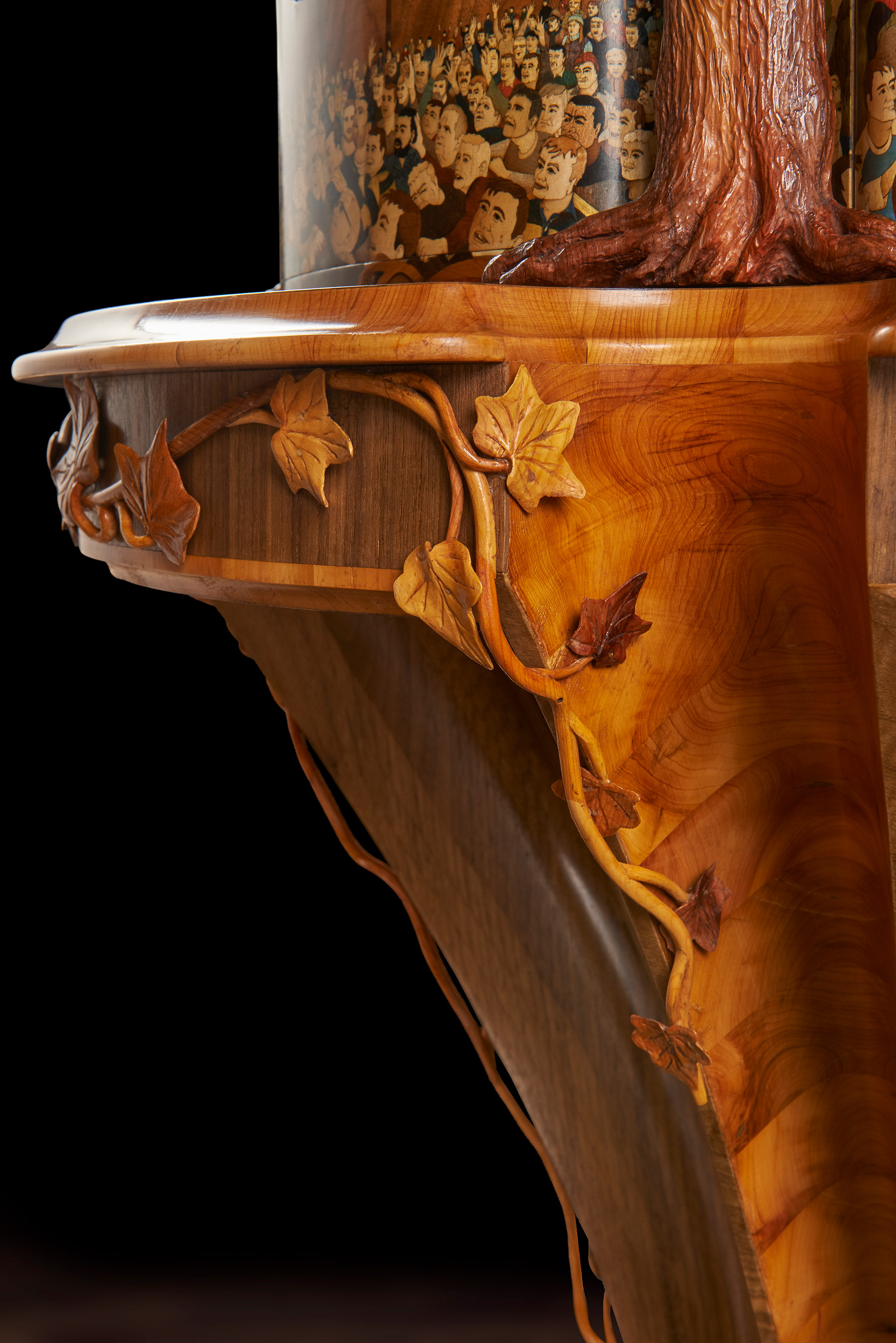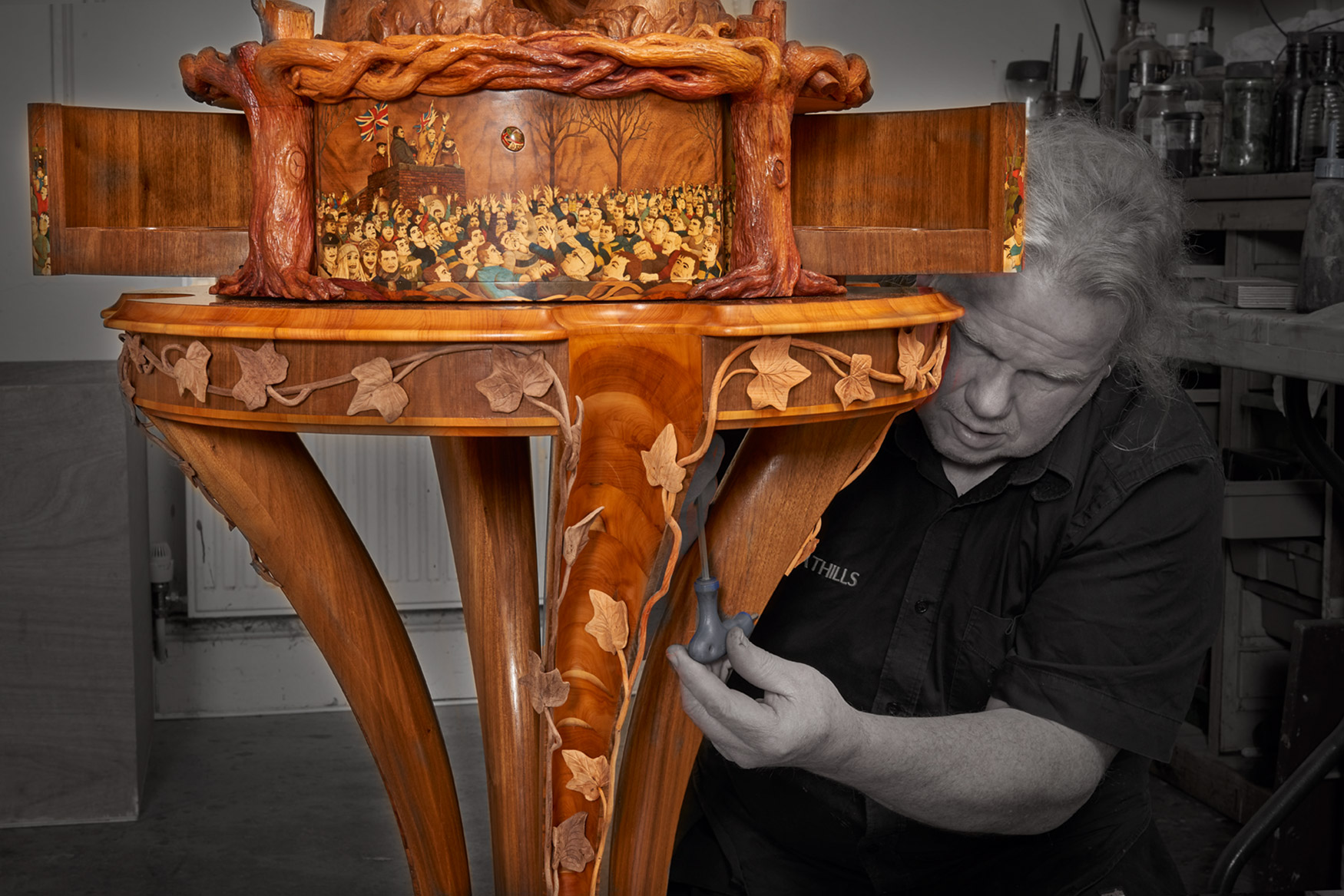 The memory box is also carved with a walnut tree and at the release of a concealed button, the sides open to reveal engraved crystal glasses. A further drawer, to keep safe mementos of the match, can be released with the press of a second secret button. The sculpture sits on a specially created burr walnut and yew wood table – on which it can rotate. The stand’s four delicate serpentine legs have been cleverly engineered to rest on the short grain of the wood – furniture legs usually rely for strength on the long grain cut. ‘We wanted to create that sense of wonder, to make the viewer question how on earth it worked. I was really trying to put the impossible into a piece and to encourage curiosity and interaction with it,’ said Nigel. Reflecting the time of year of the Royal Shrovetide game, the hand- carved, hollowed-out legs are decorated with climbing ivy that aligns with the walnut trees on the memory box.