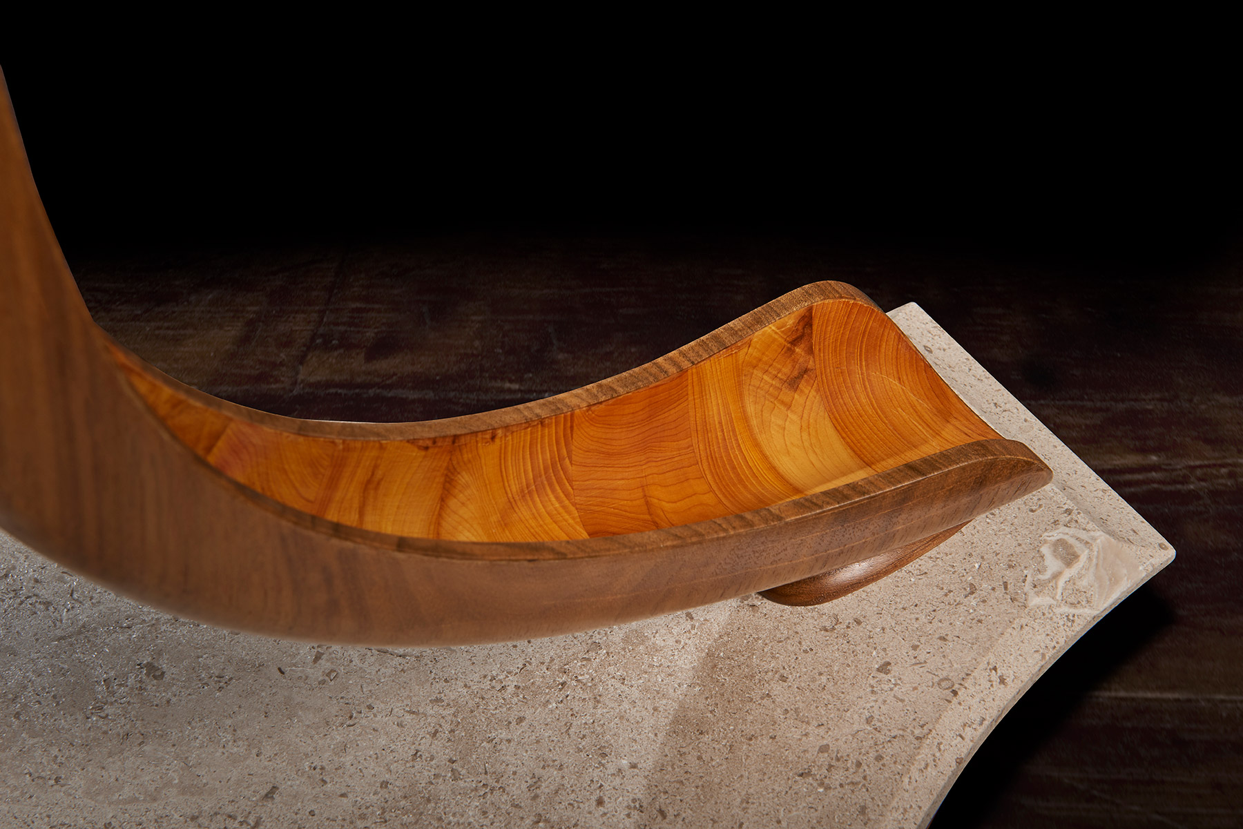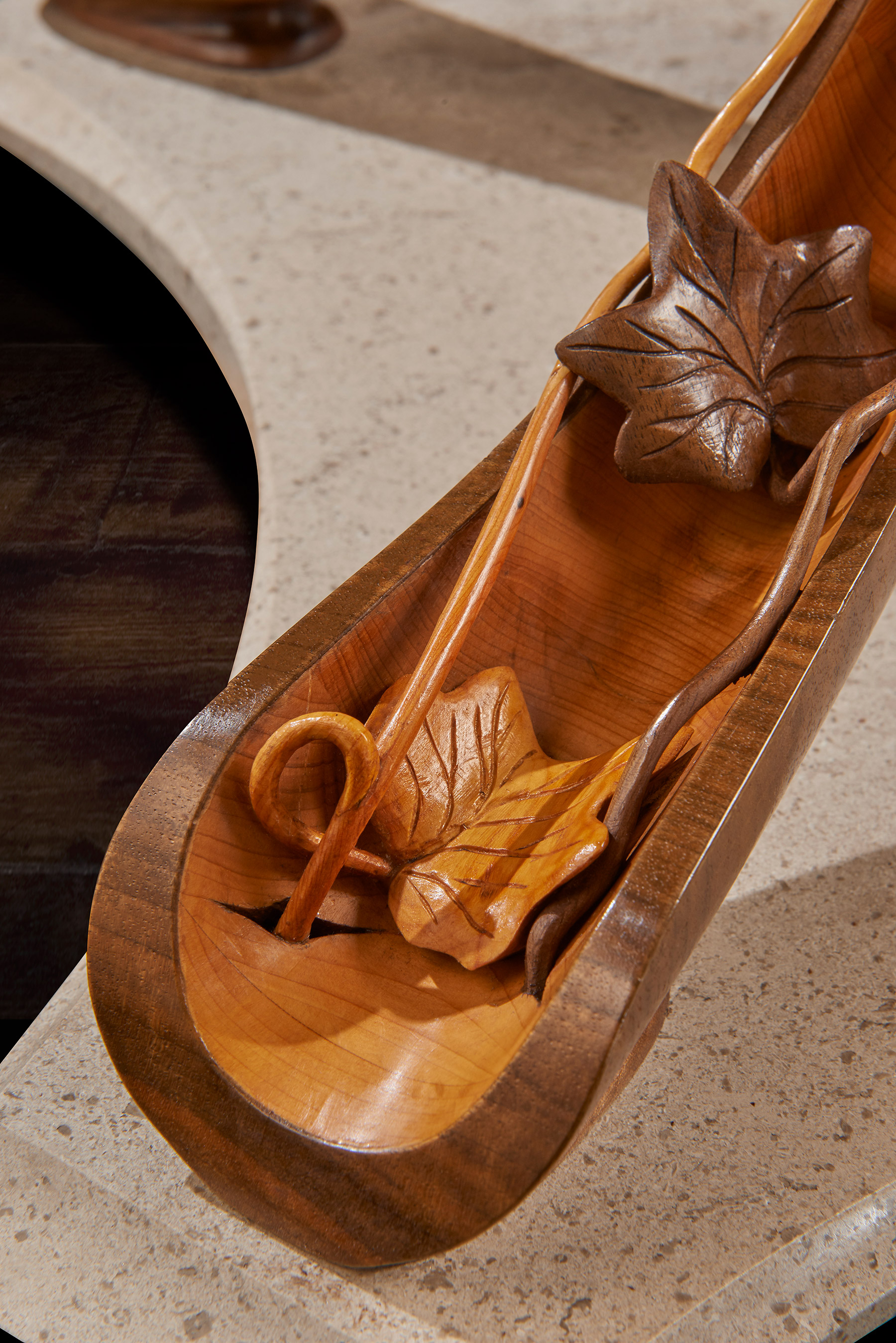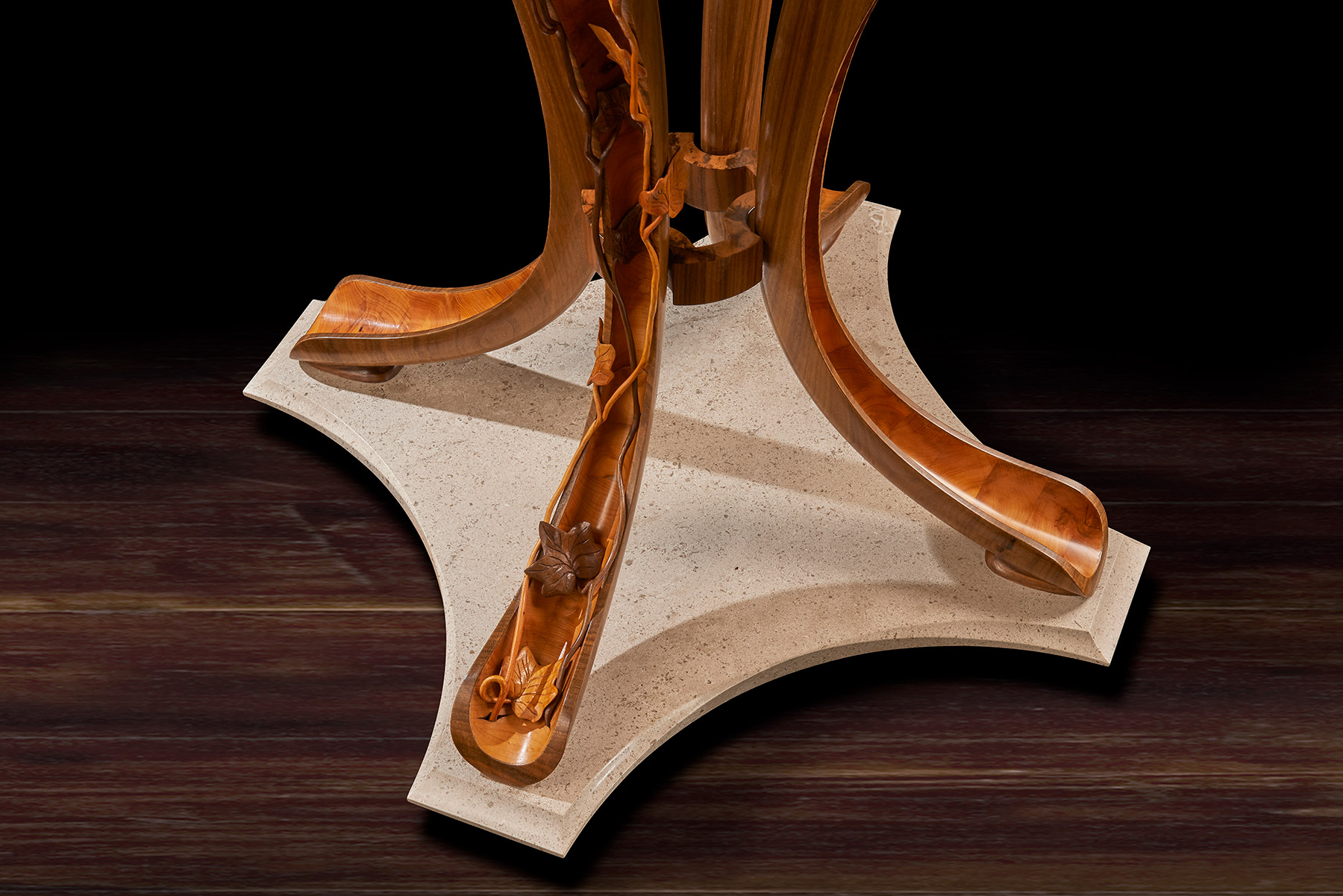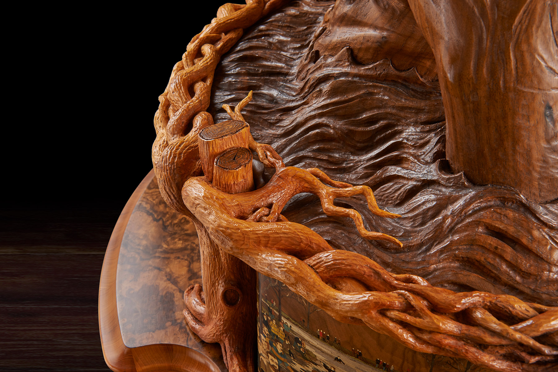 The memory box is also carved with a walnut tree and at the release of a concealed button, the sides open to reveal engraved crystal glasses. A further drawer, to keep safe mementos of the match, can be released with the press of a second secret button. The sculpture sits on a specially created burr walnut and yew wood table – on which it can rotate. The stand’s four delicate serpentine legs have been cleverly engineered to rest on the short grain of the wood – furniture legs usually rely for strength on the long grain cut. ‘We wanted to create that sense of wonder, to make the viewer question how on earth it worked. I was really trying to put the impossible into a piece and to encourage curiosity and interaction with it,’ said Nigel. Reflecting the time of year of the Royal Shrovetide game, the hand- carved, hollowed-out legs are decorated with climbing ivy that aligns with the walnut trees on the memory box.