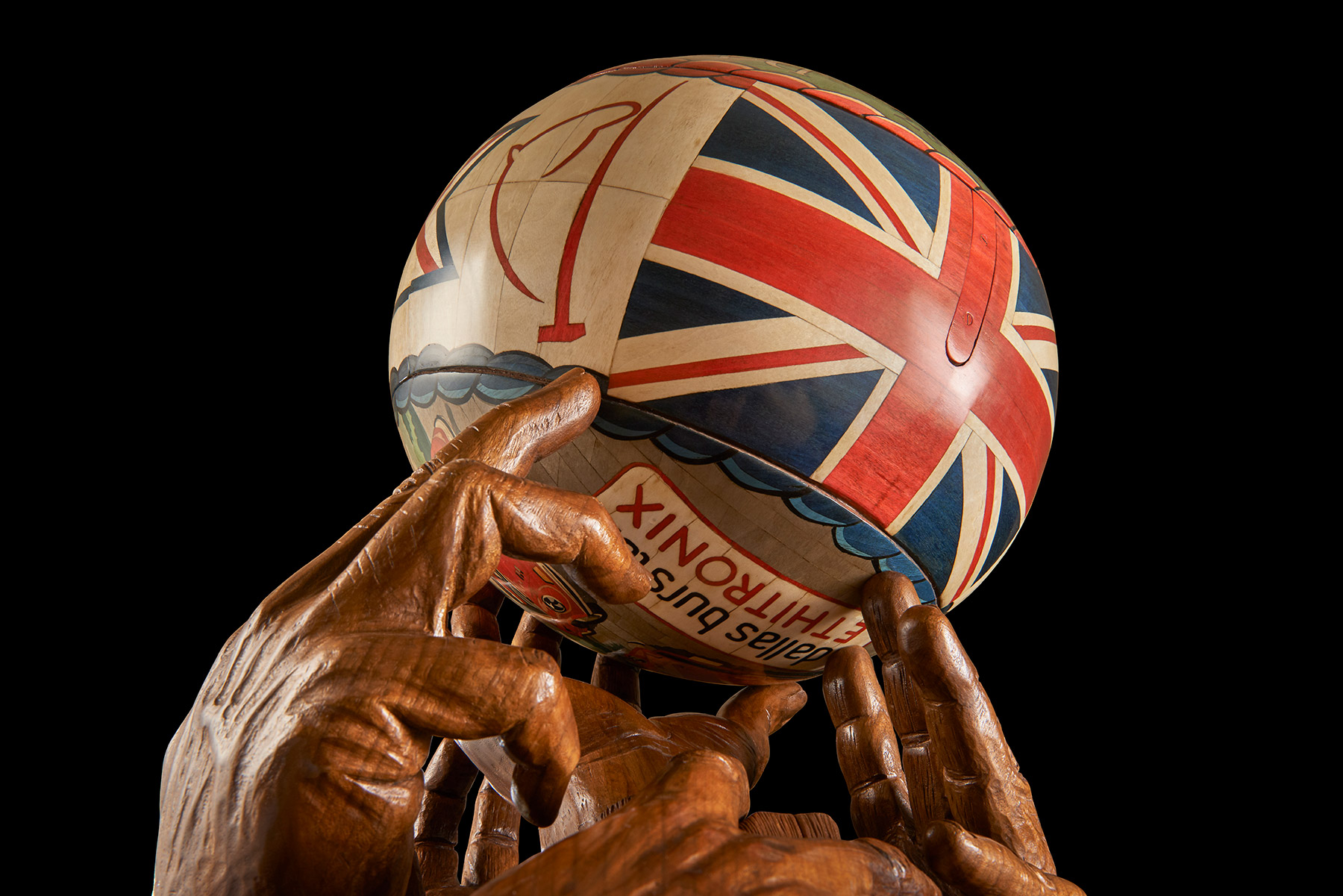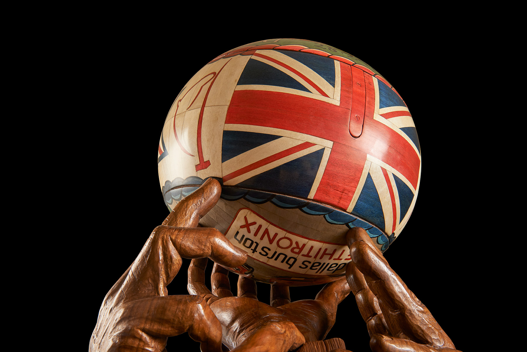 To characterise the piece the tantalus would be carefully hidden inside a detailed replica of the ball Dr Burston had turned up and the ball, larger than a traditional football, would be held aloft by the hands of the players.