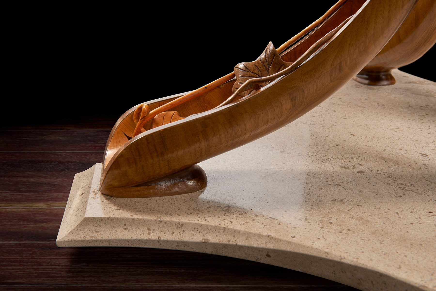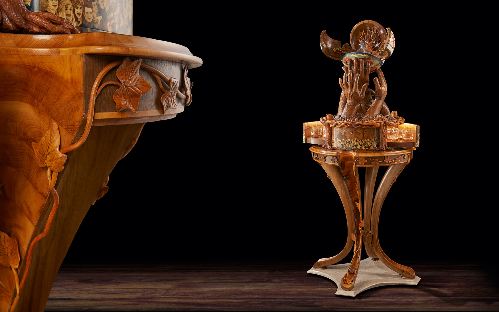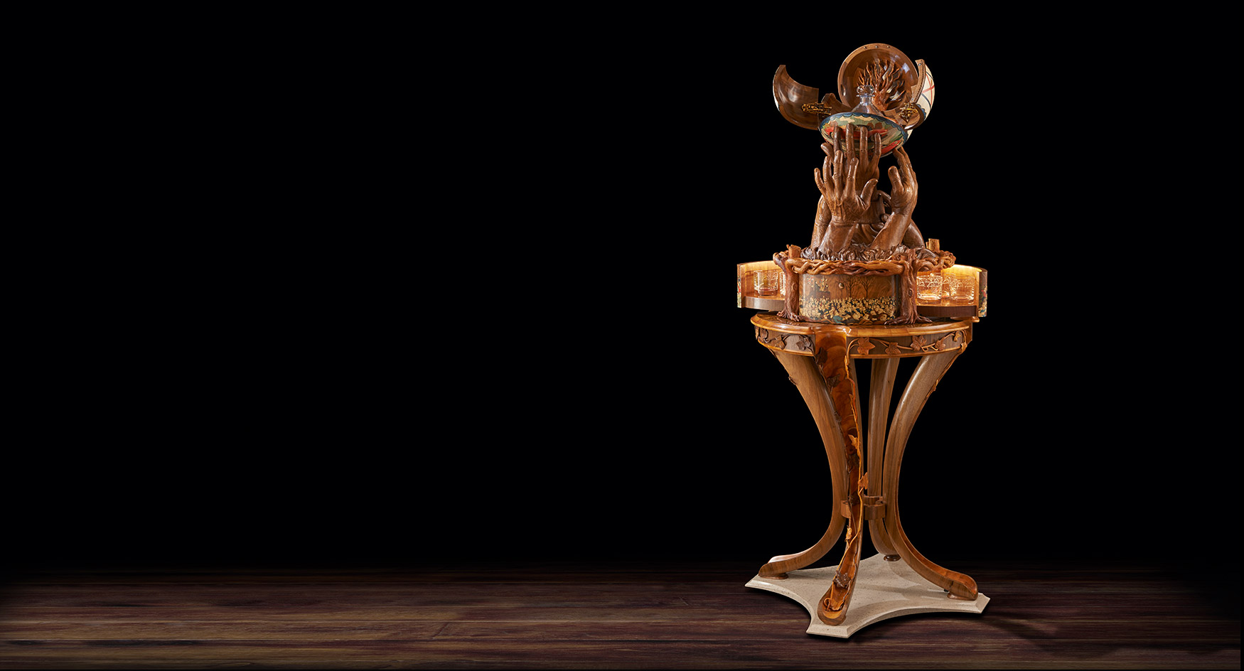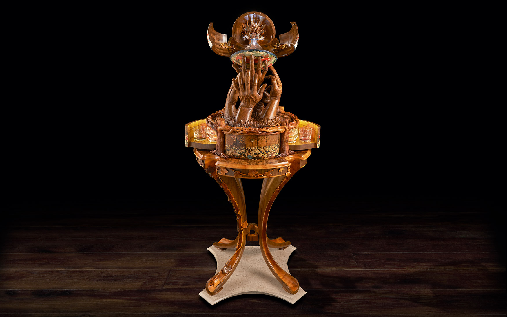 With the focal point decided, other parts of the story went into making the piece complex and modular. The dramatic sculpture would surmount an intricately designed and decorated memory box set on a magnificent stand.