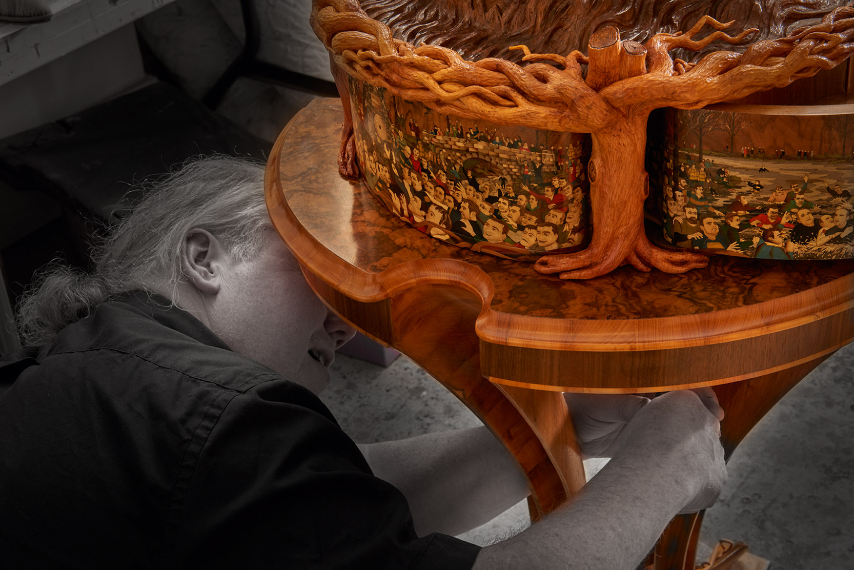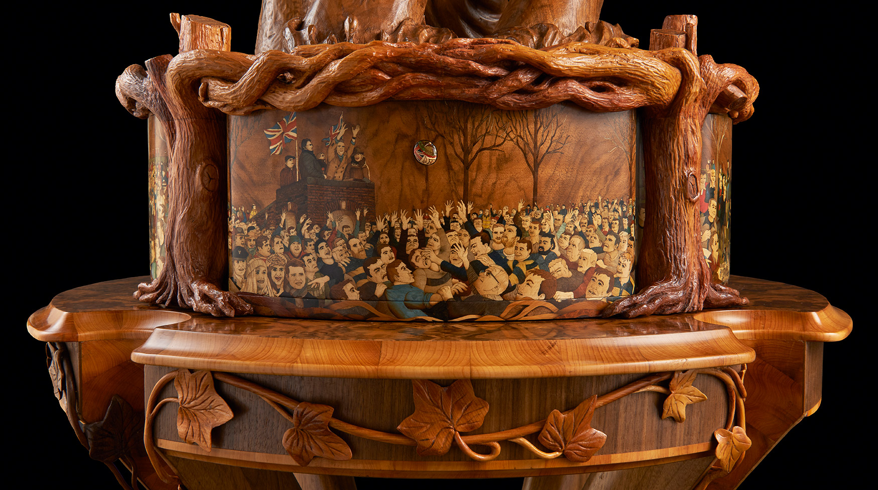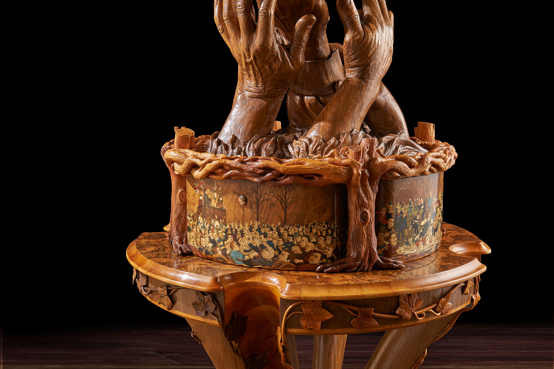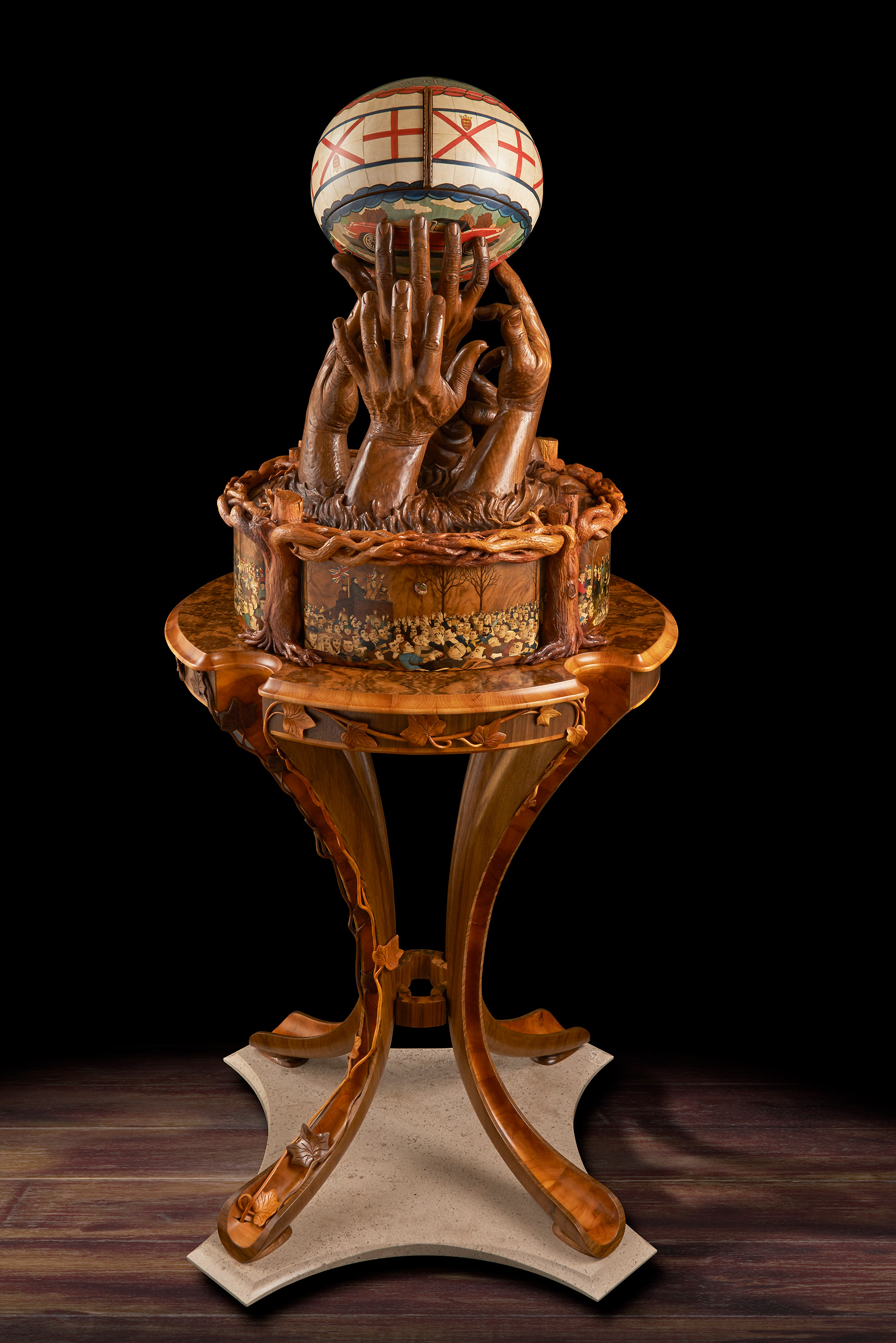 Four carved hands emerging from water hold the ball aloft, forming the top of a memory box. We can identify the elation and sense of anticipation of the player whose fingertips are about to gain the ball, locate the anger of the player who knows he’s out of the running and can only reach in frustration at the shirt sleeve of a competitor. In a flash the intense physicality of the game and the environment in which it is played have been captured. Nigel’s film footage, drawings, new photographs, plasticine maquettes and plaster casts were all stages in creating the hands. In fact, it’s the carver’s own hands that are represented in the finished walnut pieces – a masterly self-portrait of muscle, with cuts and even a broken fingernail. The memory box itself is decorated with four brightly coloured marquetry panels of scenes from the game which feature 75 tiny detailed portraits of people who were present. At a presentation for those who attended the match at Ashbourne British Legion, players who spotted themselves in Nigel’s photographs were asked to pose for another photograph which was used to create their marquetry portrait. As Nigel said: ‘In order that the entire sculpture sings, every element has to be right!’