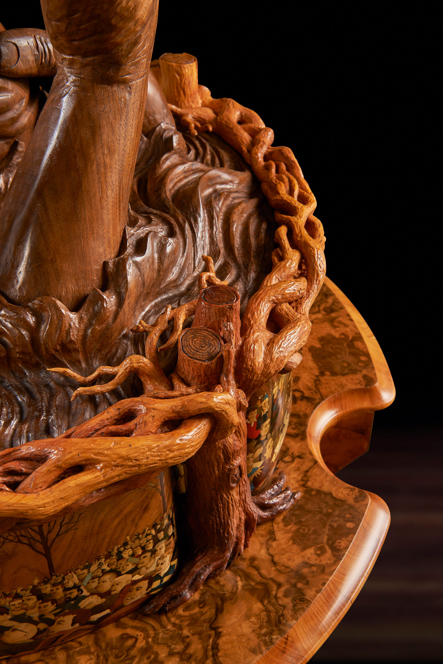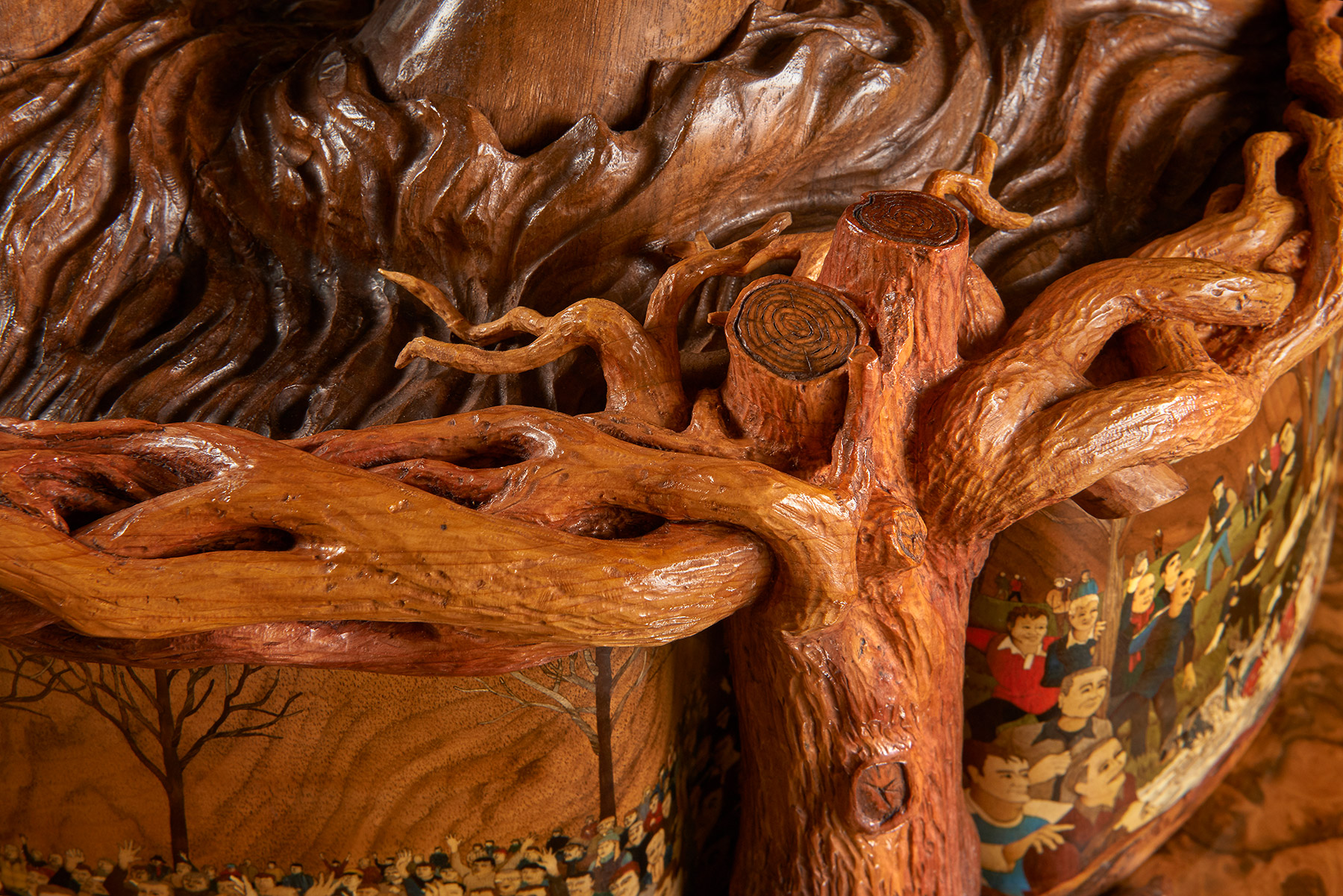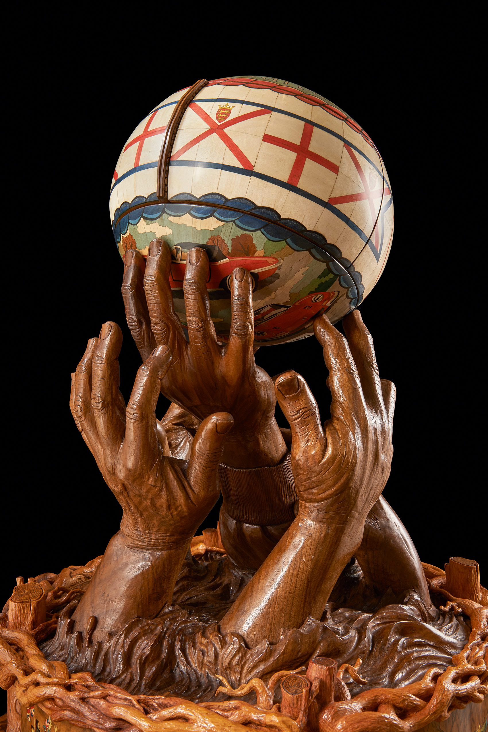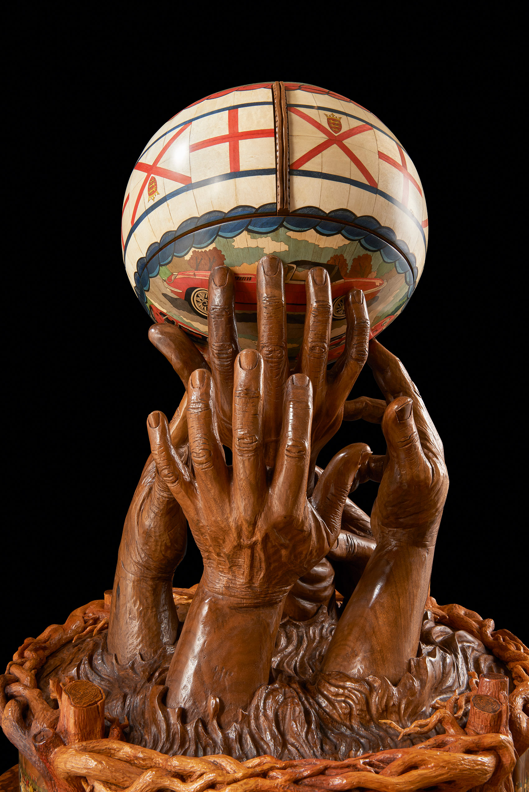 Four carved hands emerging from water hold the ball aloft, forming the top of a memory box. We can identify the elation and sense of anticipation of the player whose fingertips are about to gain the ball, locate the anger of the player who knows he’s out of the running and can only reach in frustration at the shirt sleeve of a competitor. In a flash the intense physicality of the game and the environment in which it is played have been captured. Nigel’s film footage, drawings, new photographs, plasticine maquettes and plaster casts were all stages in creating the hands. In fact, it’s the carver’s own hands that are represented in the finished walnut pieces – a masterly self-portrait of muscle, with cuts and even a broken fingernail. The memory box itself is decorated with four brightly coloured marquetry panels of scenes from the game which feature 75 tiny detailed portraits of people who were present. At a presentation for those who attended the match at Ashbourne British Legion, players who spotted themselves in Nigel’s photographs were asked to pose for another photograph which was used to create their marquetry portrait. As Nigel said: ‘In order that the entire sculpture sings, every element has to be right!’