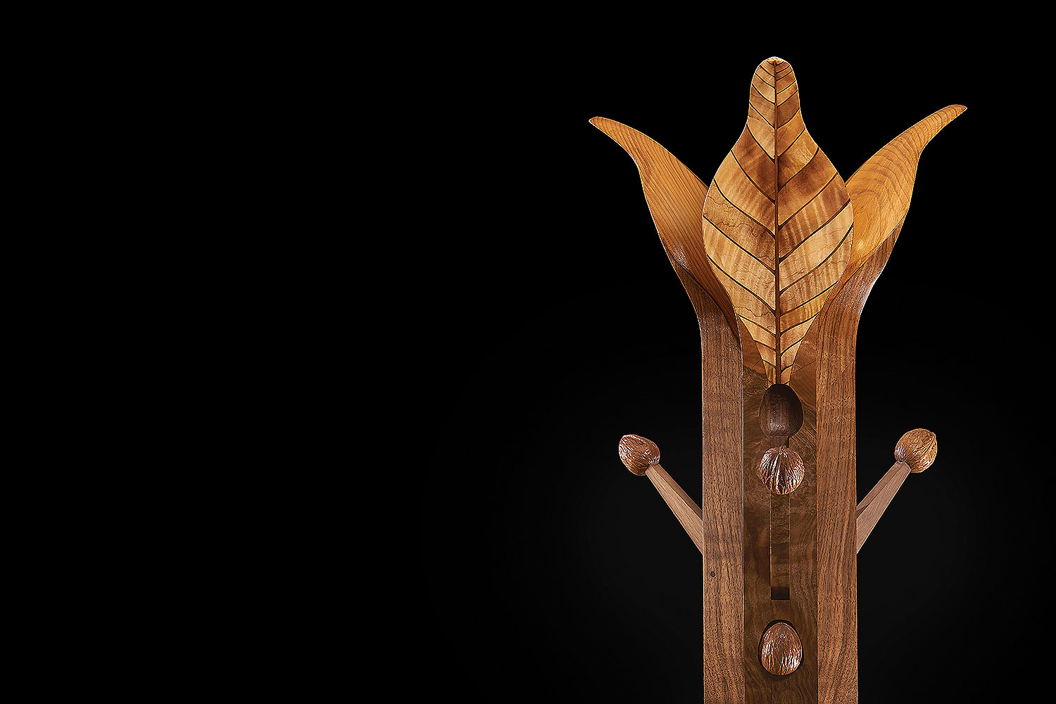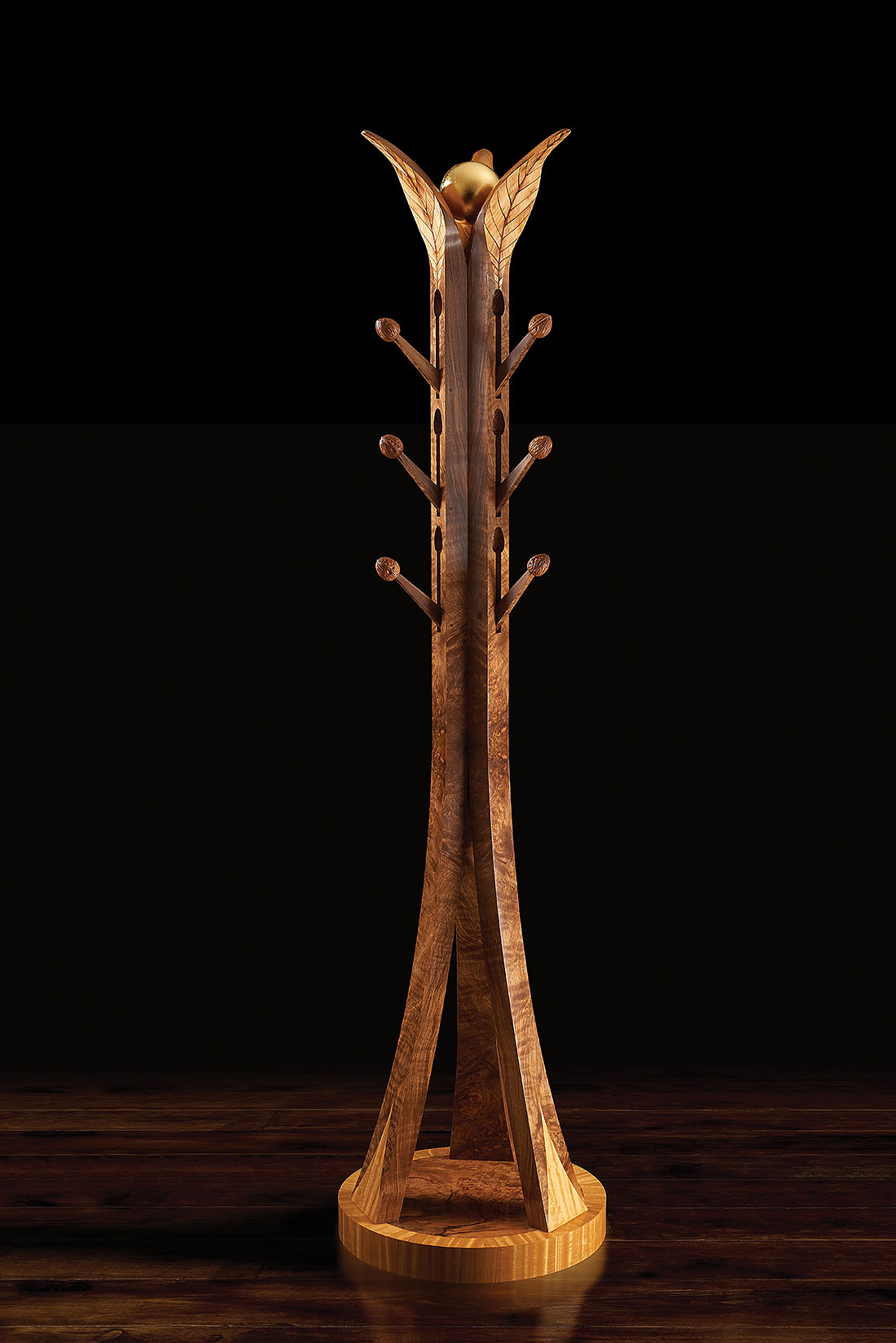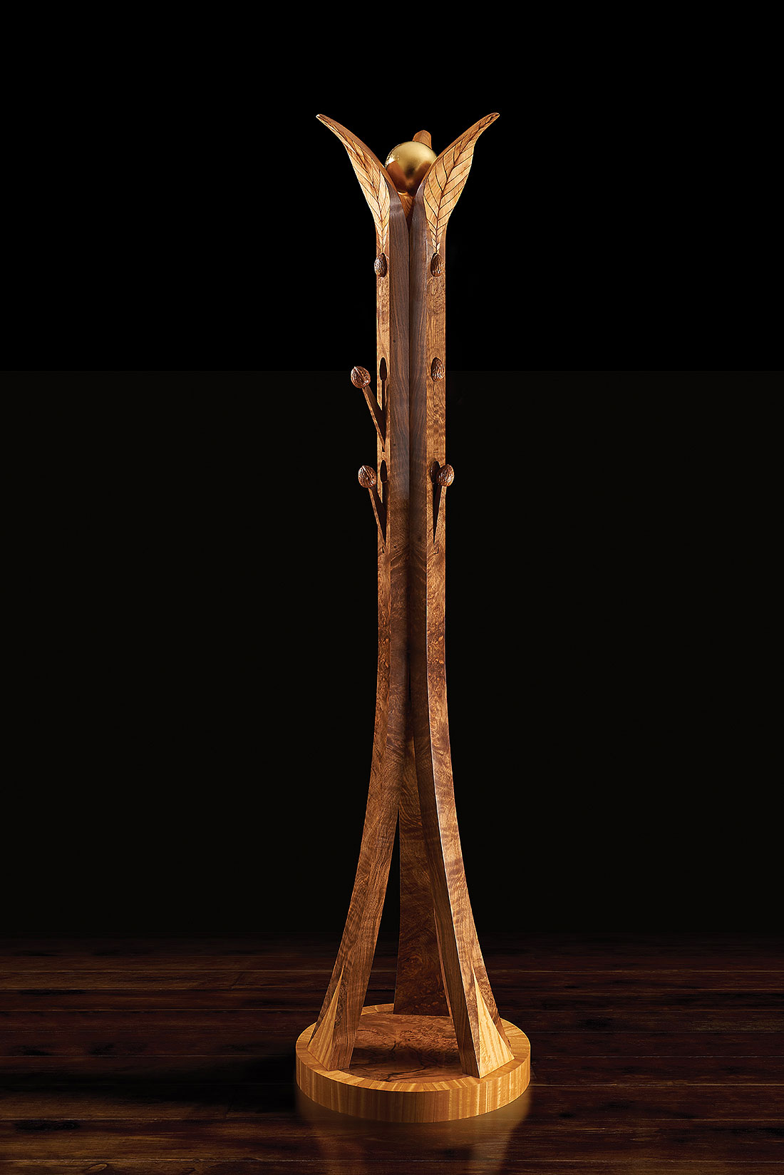 The resulting piece is a paean to nature and largely inspired by the structure of three particularly pleasant shaped leaves from a lovely walnut tree which grows in our grounds at Wheathills. In our design, the leaf stems have been elongated to form the butt walnut supports of the coat stand. These emerge from a circular base of satinwood and figured walnut, which symbolically represents the moon reflecting in a pool.