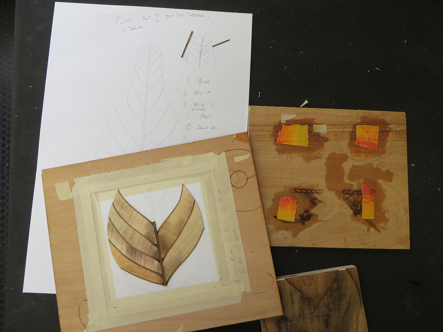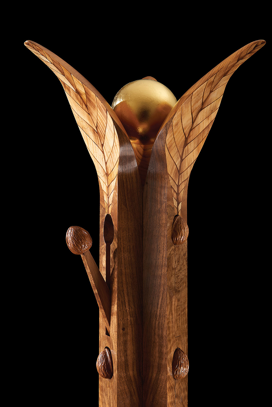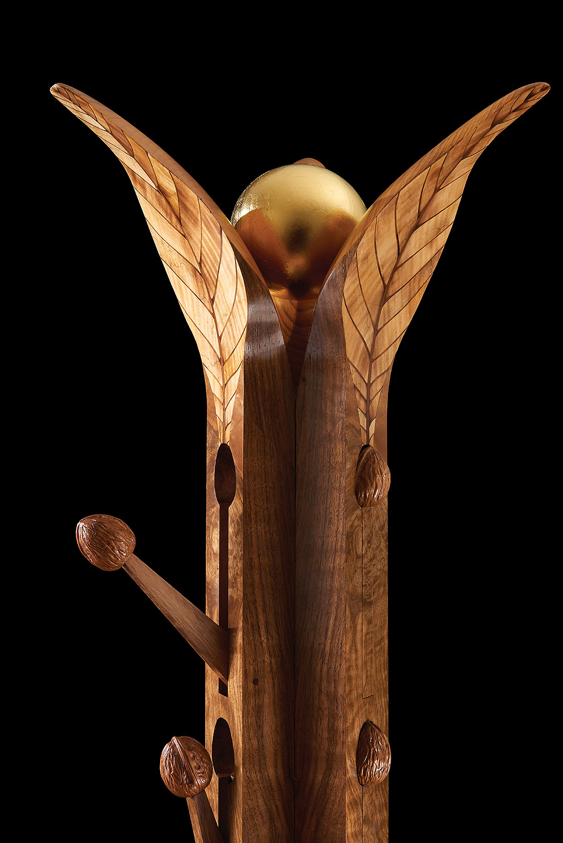 The resulting piece is a paean to nature and largely inspired by the structure of three particularly pleasant shaped leaves from a lovely walnut tree which grows in our grounds at Wheathills. In our design, the leaf stems have been elongated to form the butt walnut supports of the coat stand. These emerge from a circular base of satinwood and figured walnut, which symbolically represents the moon reflecting in a pool.