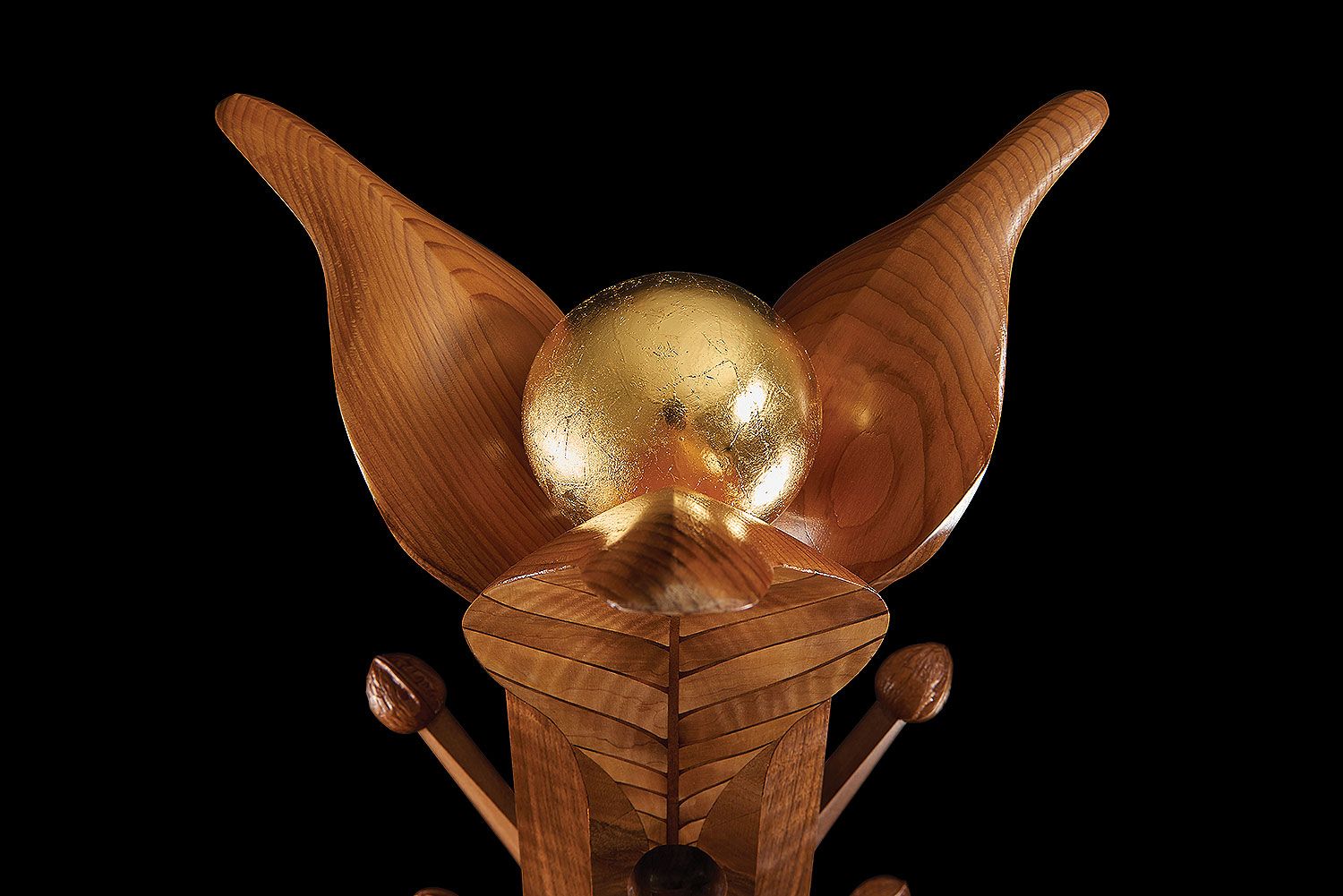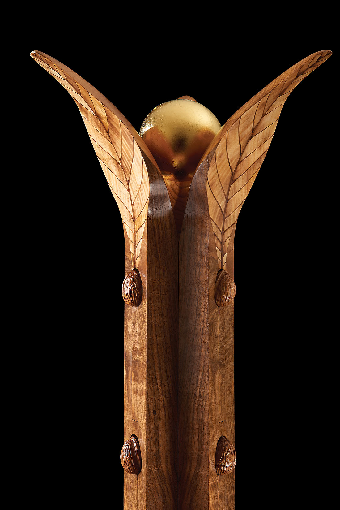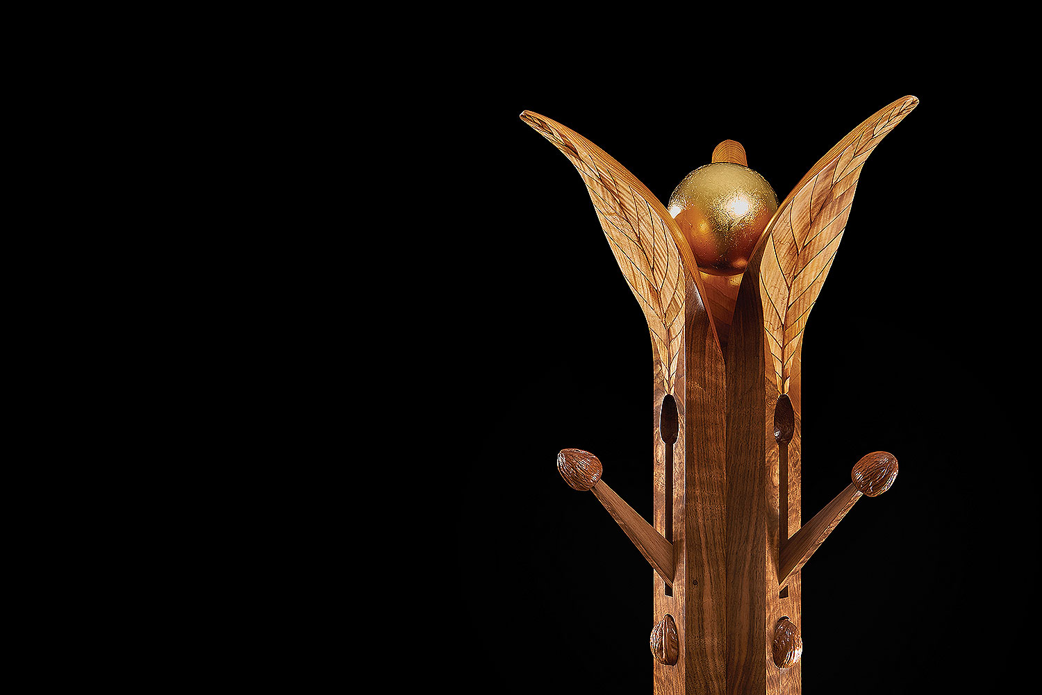 At the apex of this beautiful and unusual coat stand a 23 carat gold ball, representing the rising sun, peeps from between the out-splayed marquetry leaves reflecting gold onto the backs of the leaves.