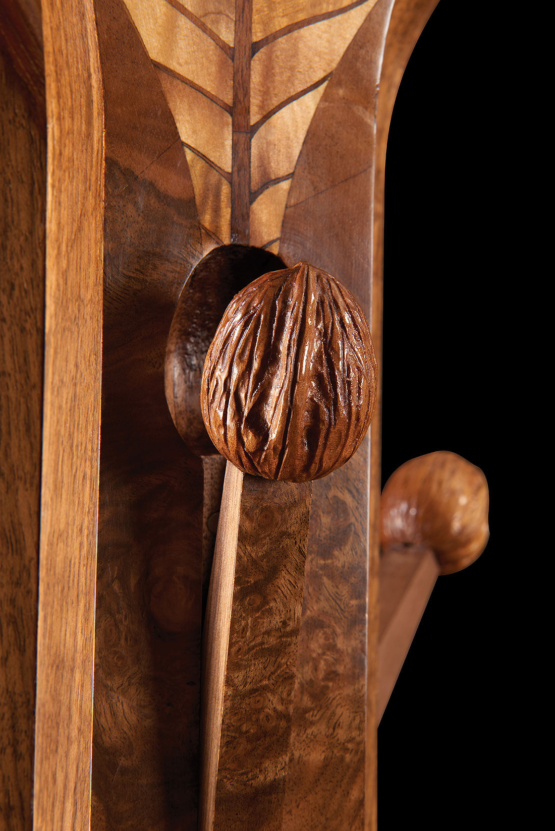 By the mystical magic of Wheathills’ engineering, the coat pegs can be released from the “leaf stem” support by pressing on each of the nine hand-carved walnuts which “grow” from the leaf stem. Each of the carved walnuts, which spring into life as a coat peg, were copied from individual true walnuts.