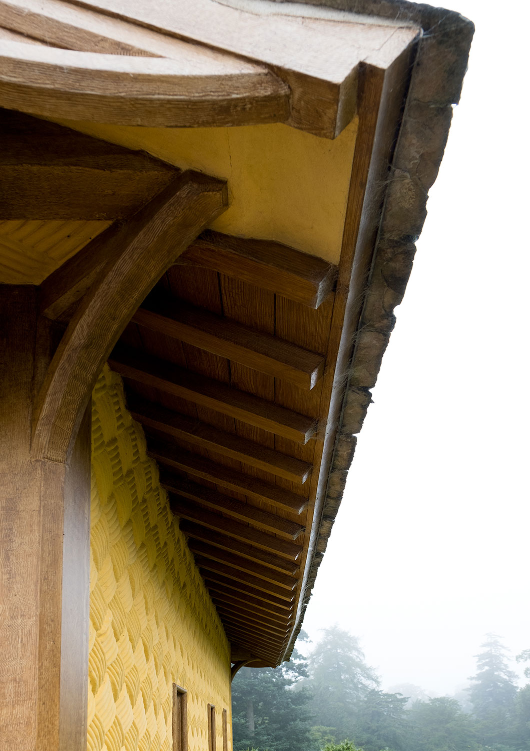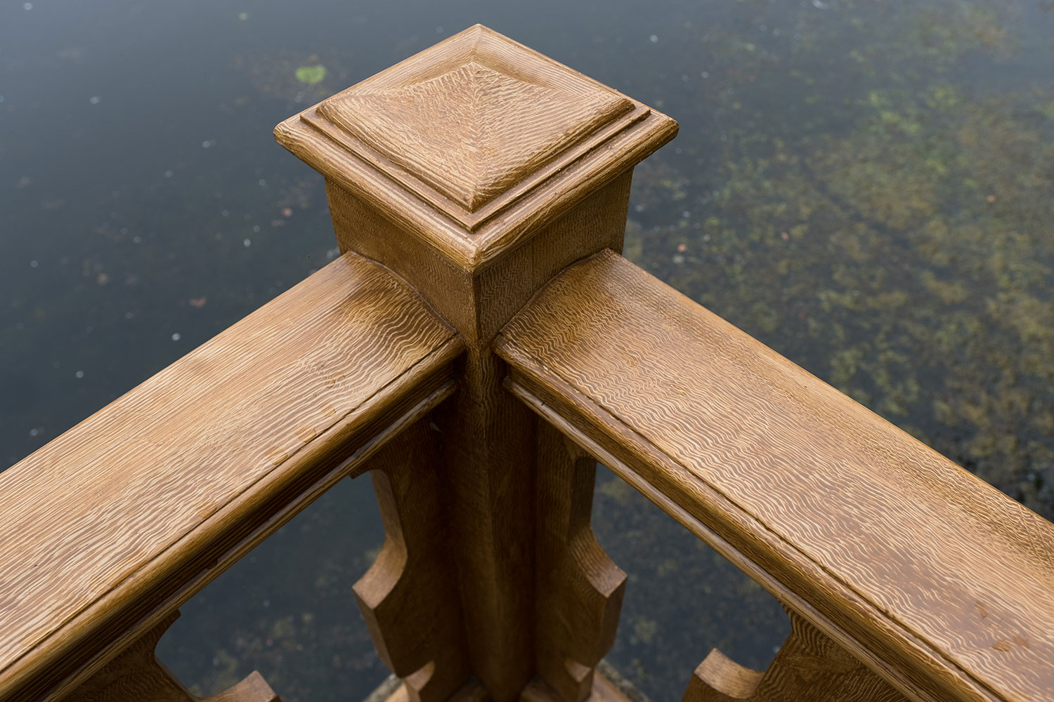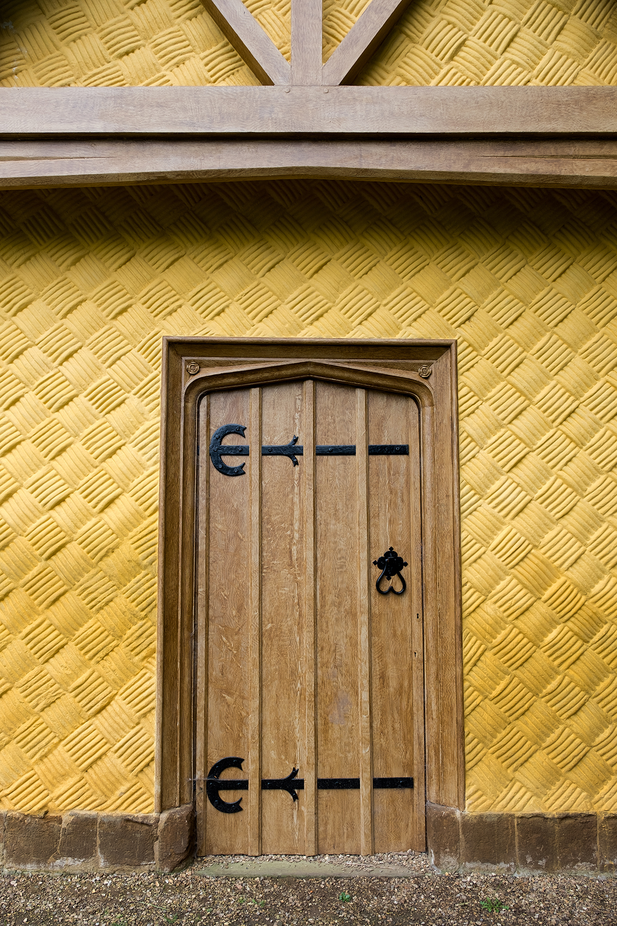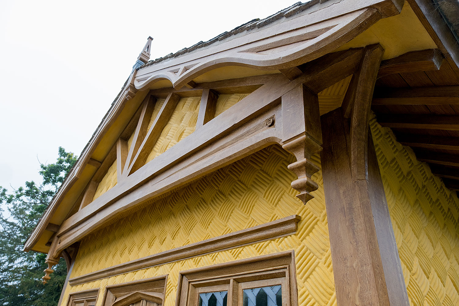 Our team of skilled craftsmen repaired the original basket pargeting, replacing sections and repairing cracks. Seven coats of lime wash were applied using the original shade of golden yellow ochre. Repaired timber was grained to simulate fine quarter cut oak using feather and comb technique.