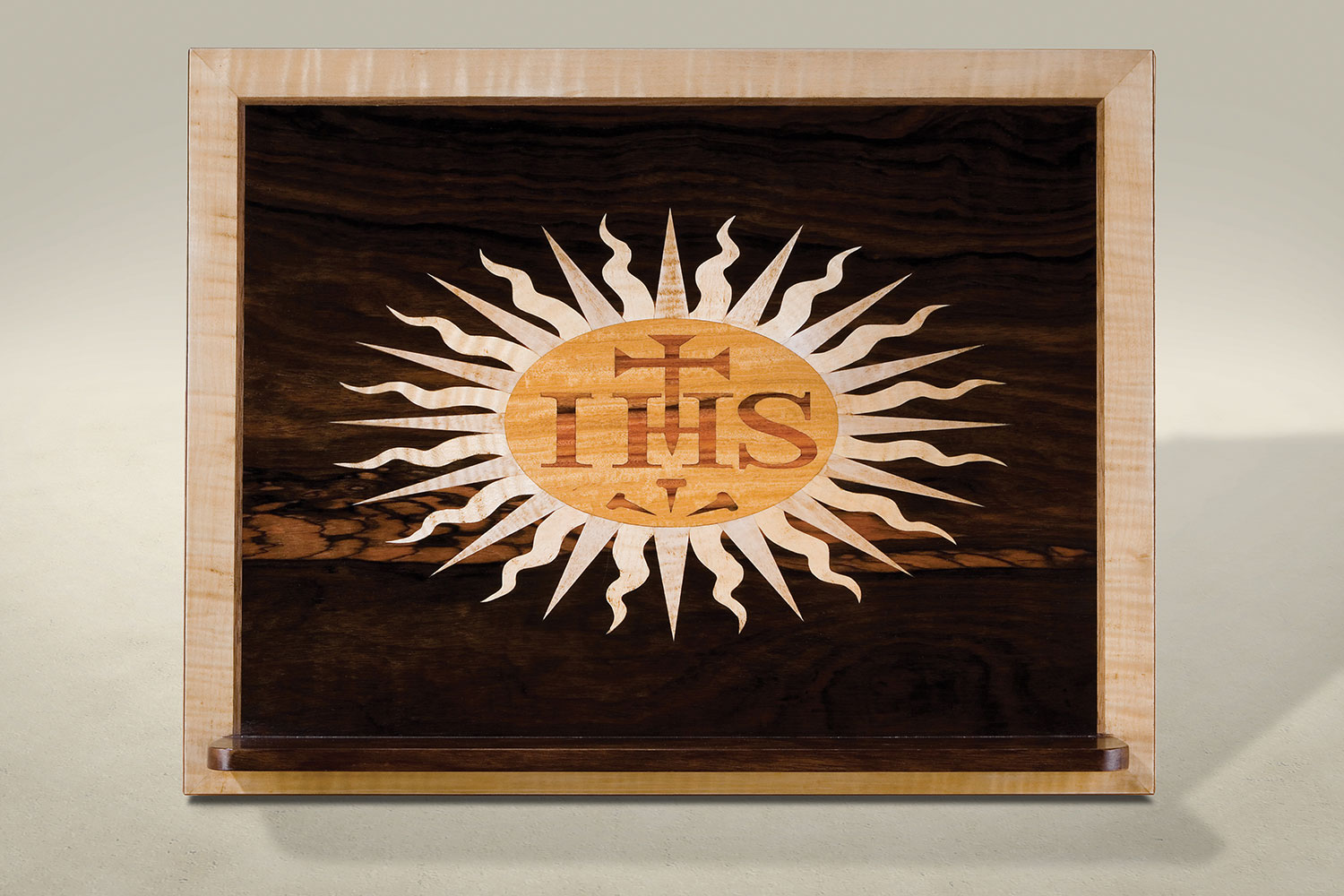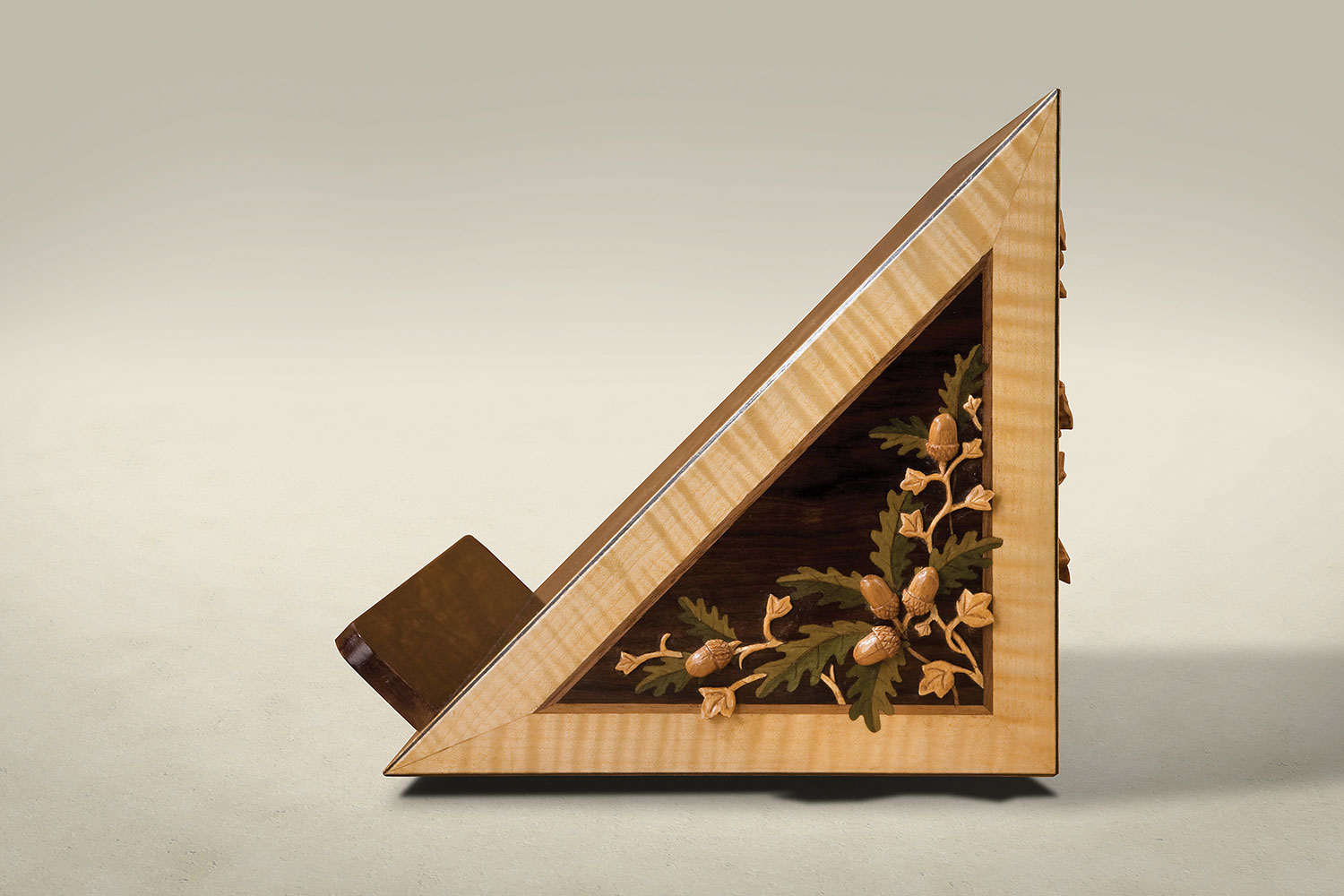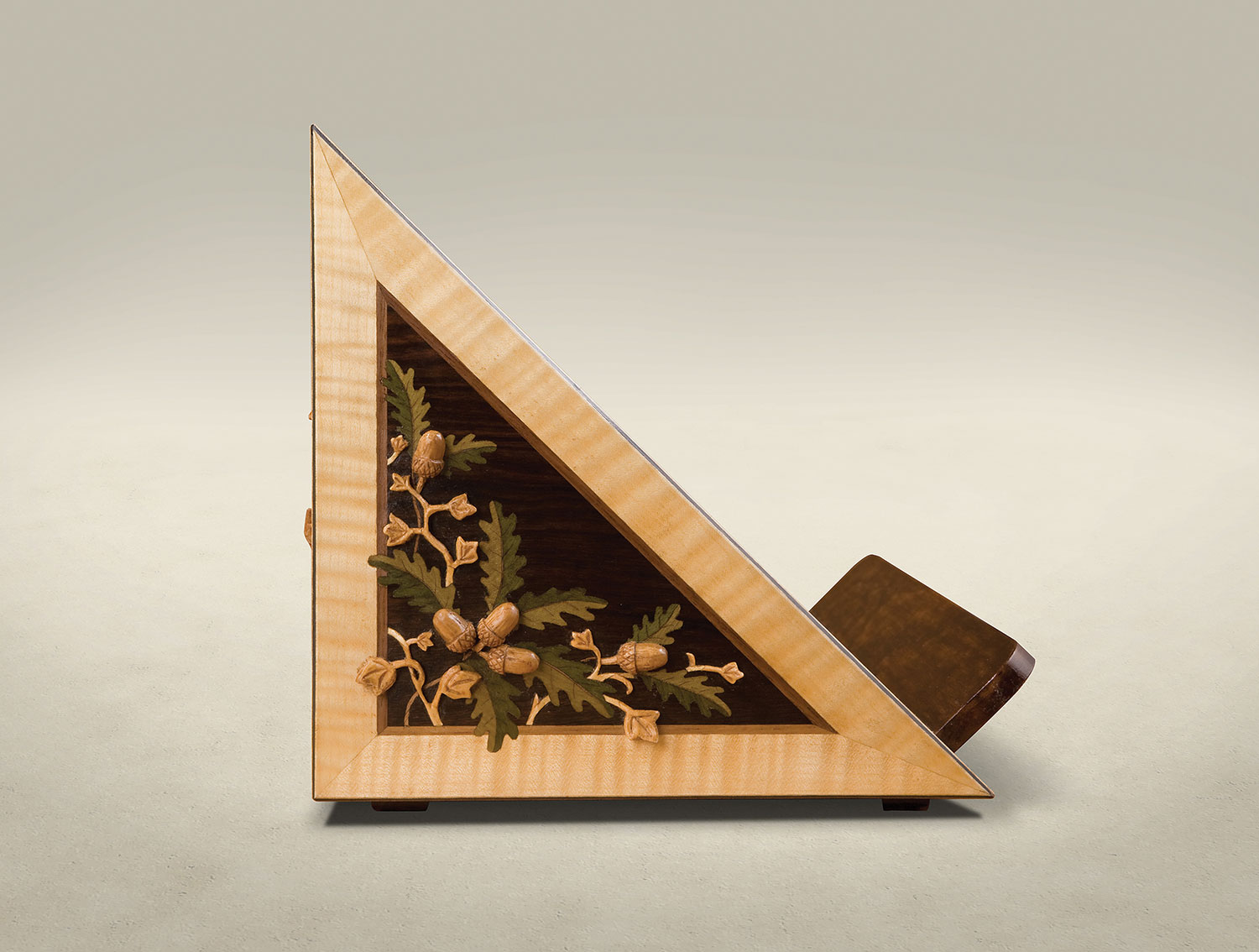 Veneered in macassar ebony, this stunning piece inlaid with the St. Mary’s insignia in sycamore and is banded to the edge in satinwood. The sides and back are decorated with marquetry. Existing church architecture was the inspiration for the carved oak leaves and acorns.