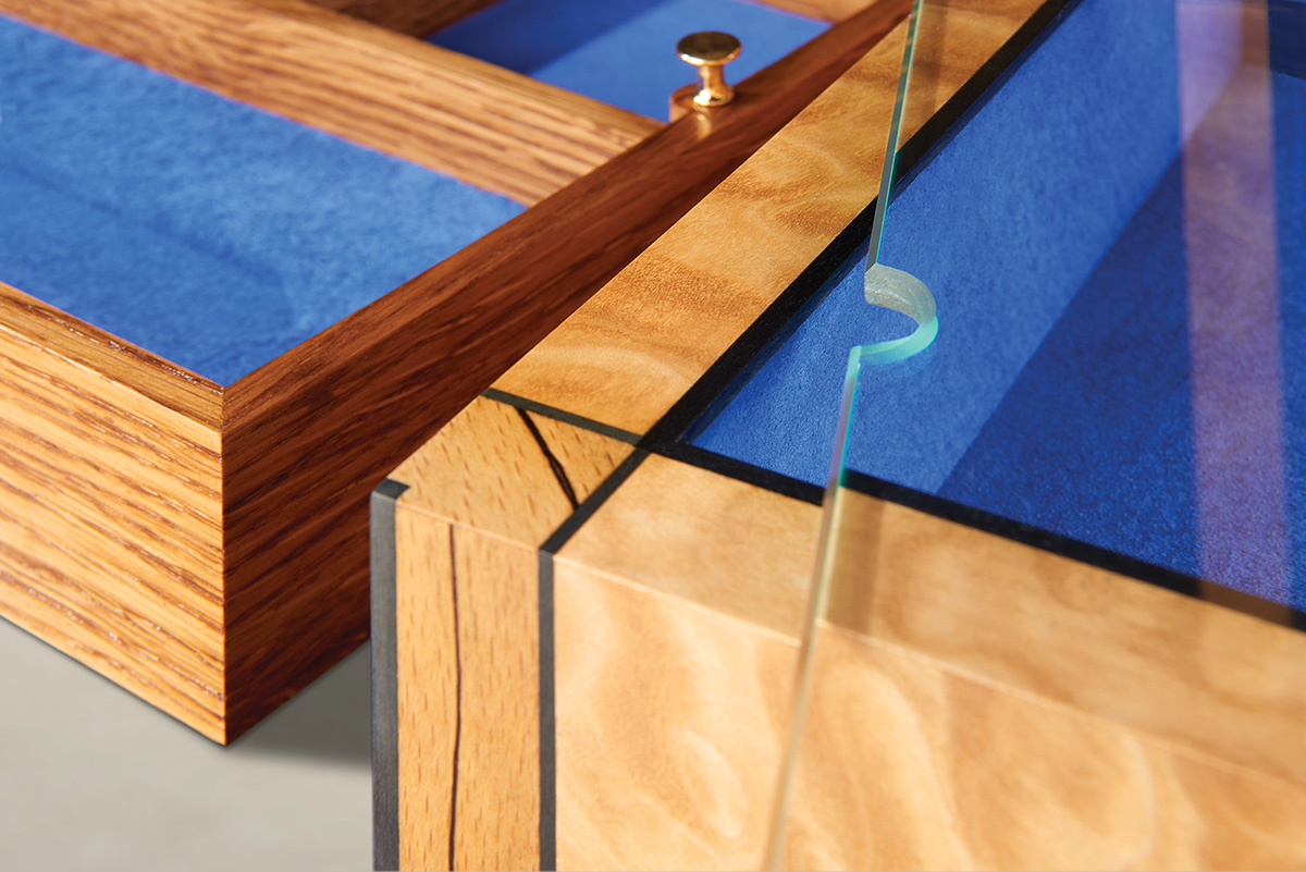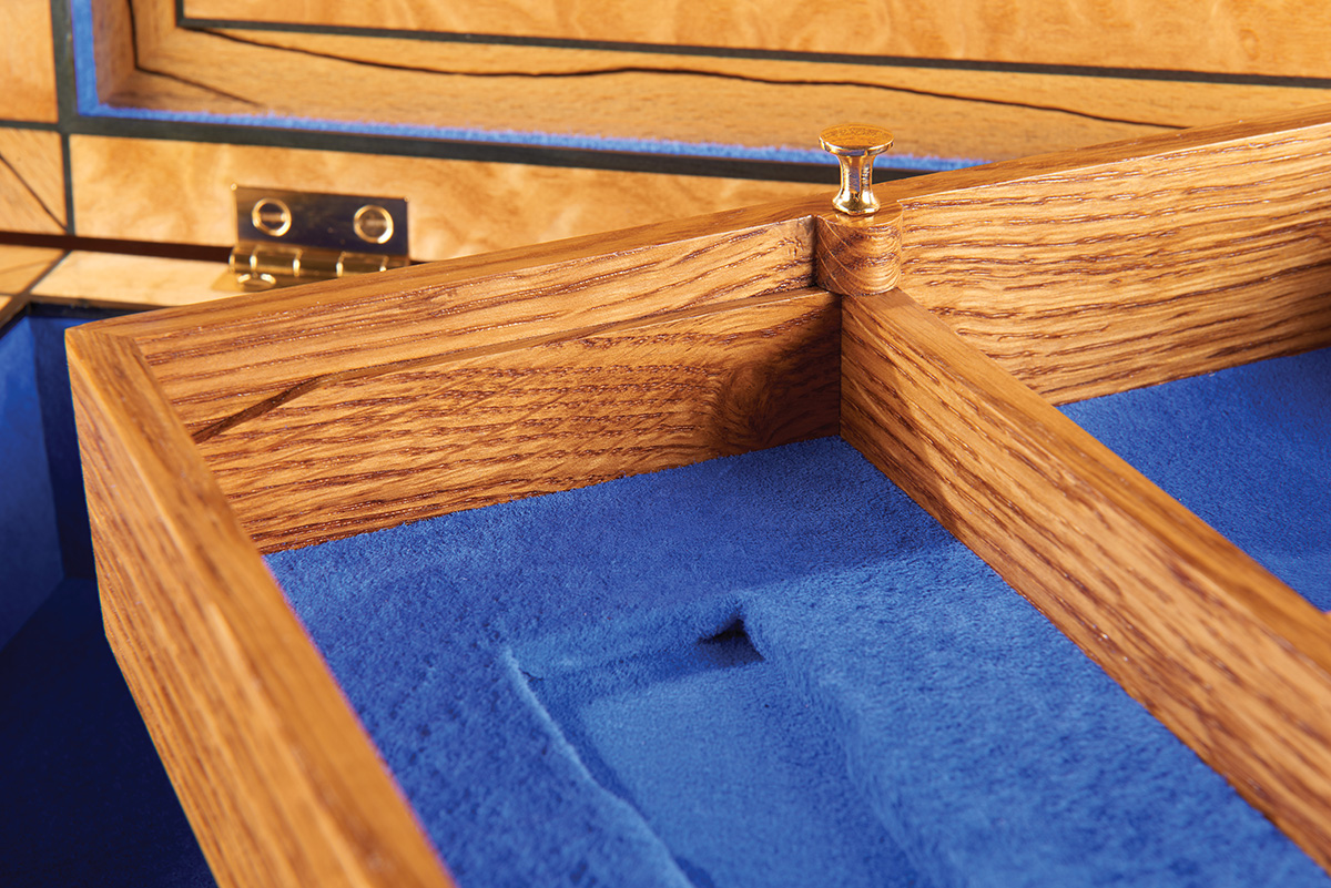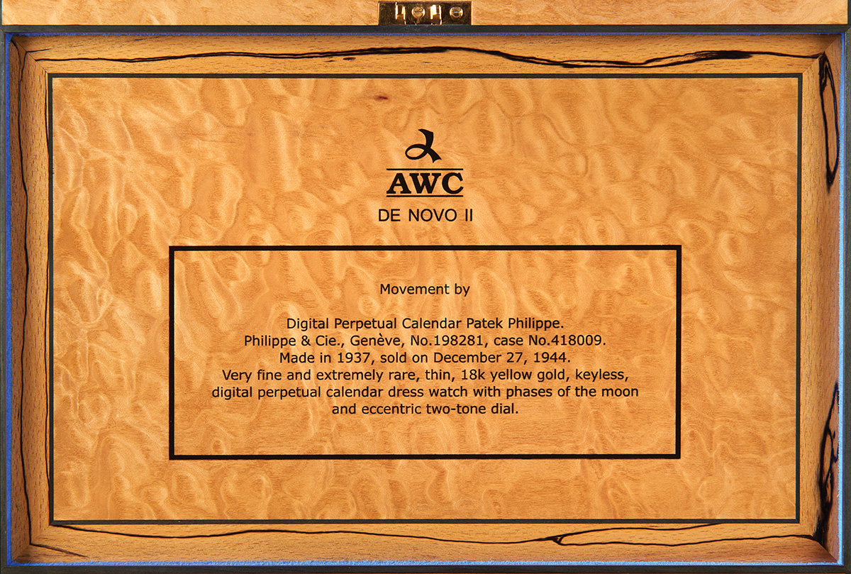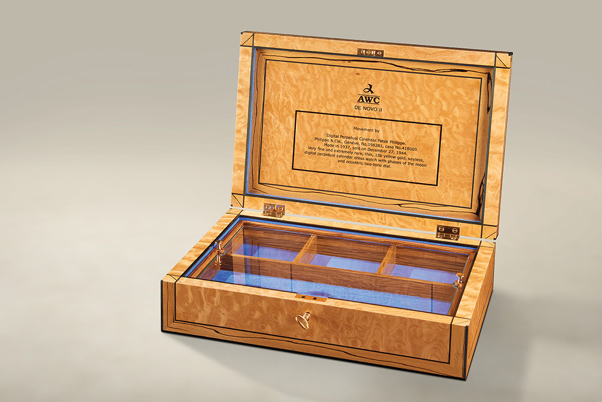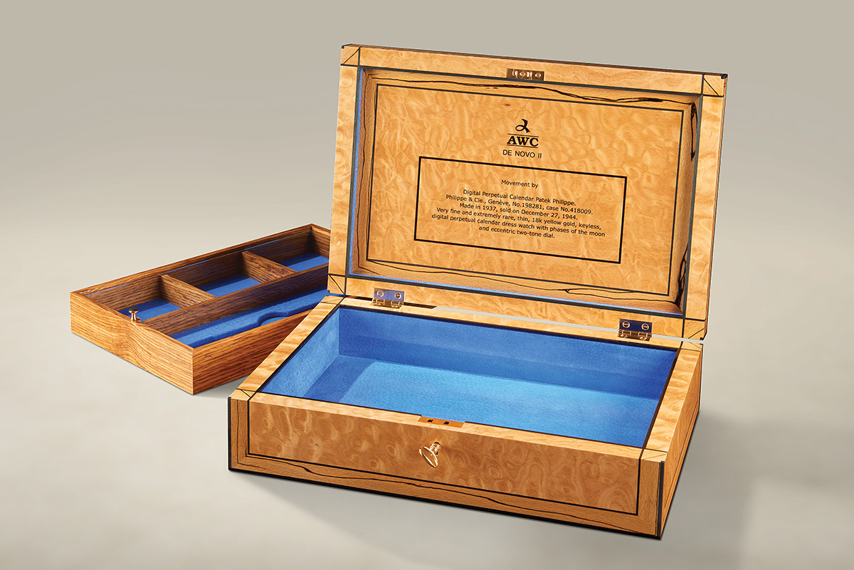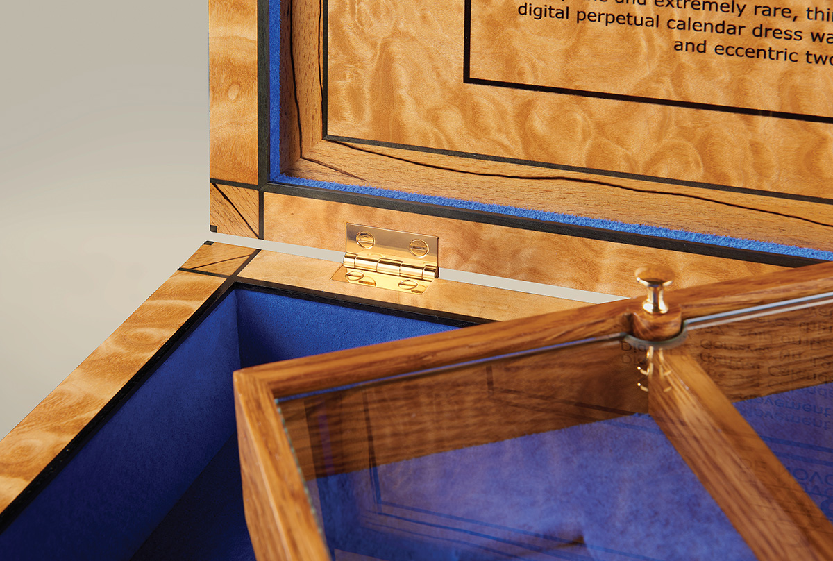 The inner lid is inlaid with a description of the watch housed within. A tiger burr brown oak tray is fitted out to accommodate the watch and its component parts. All is protected by a glass cover. The tray is fitted with rose gold handles and this metal is also used on the lid hinges. Beneath the tray the compartment remains unfitted to enable storage of documentation.