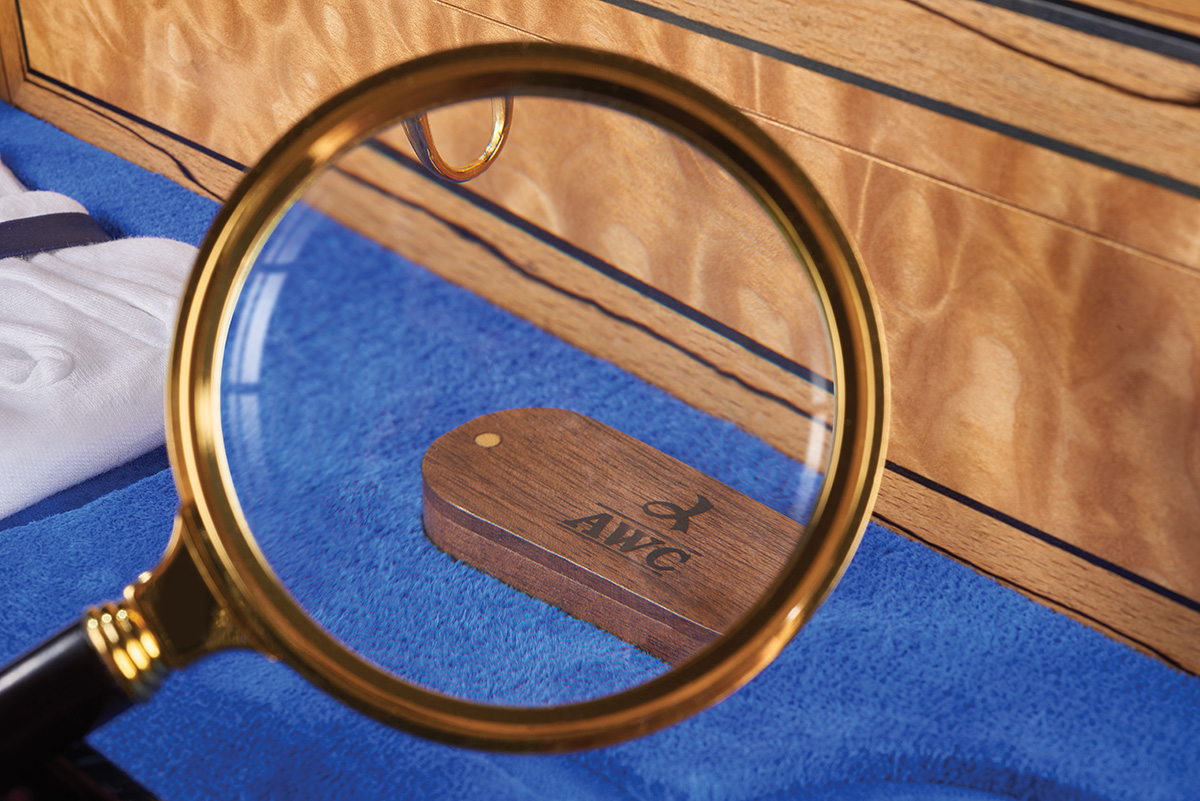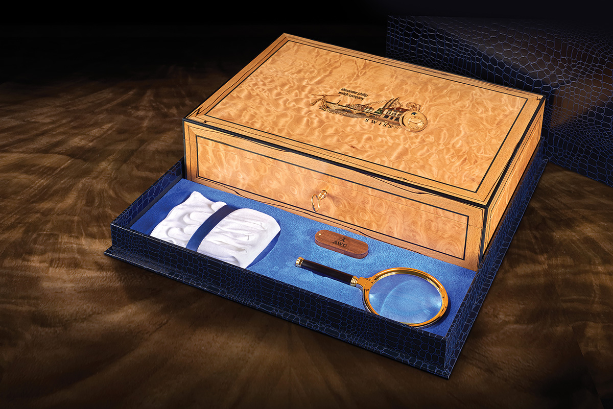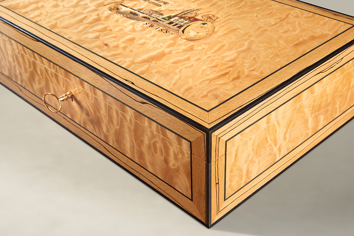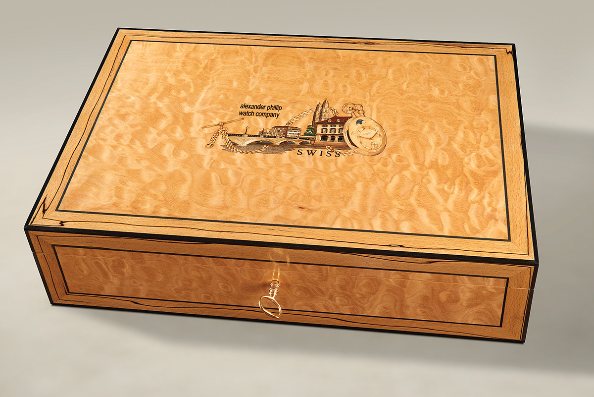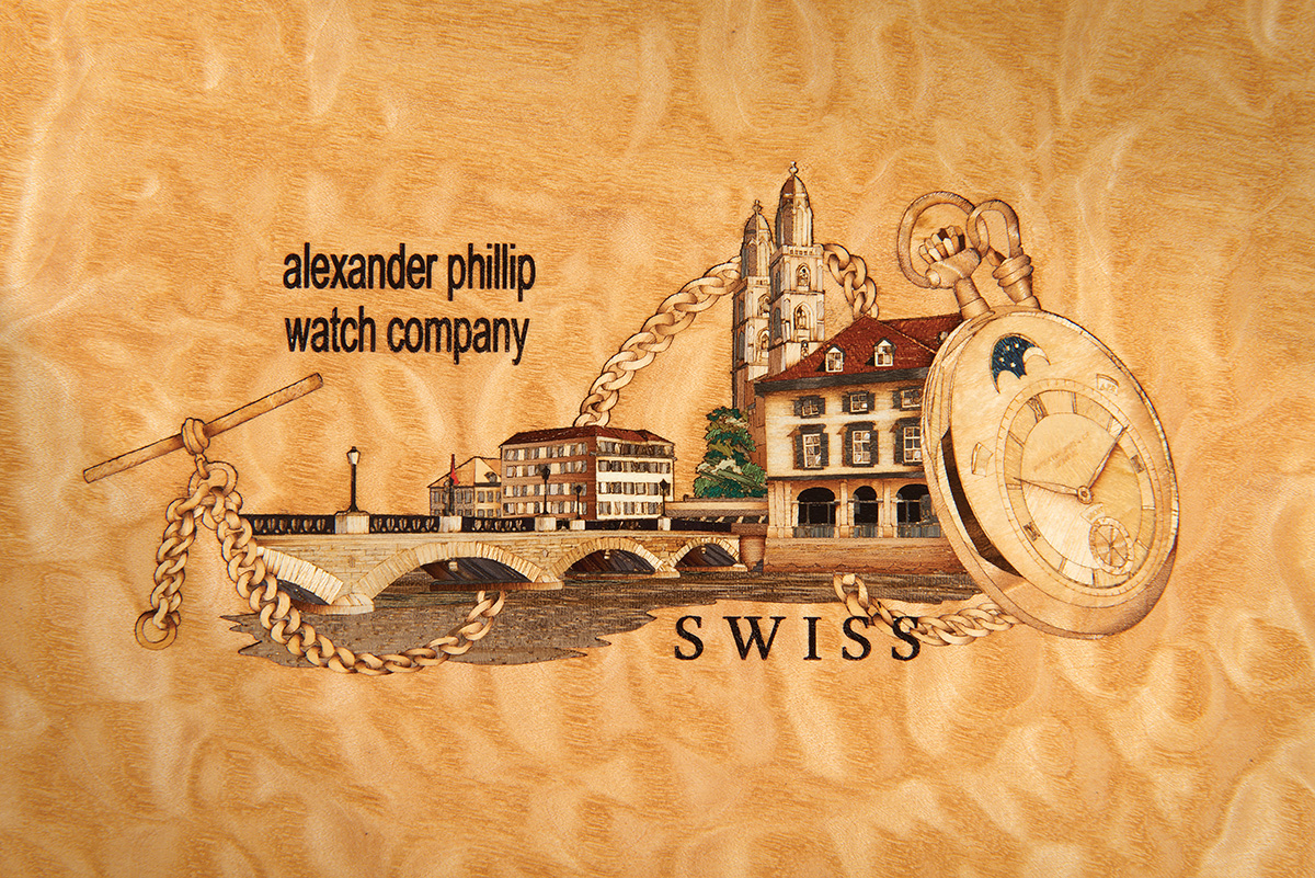 Inlaid in micro marquetry on the box lid is an image of a view in Zurich, with the Munsterbrucke Bridge spanning the Limmat river and the Grossmuster Church. This design is encompassed by an image of the original form of the Patek Philippe piece – a fob watch with chain. Our artistic representation therefore incorporates a useful record of the history of this fine piece of jewellery, now used as a wrist watch.