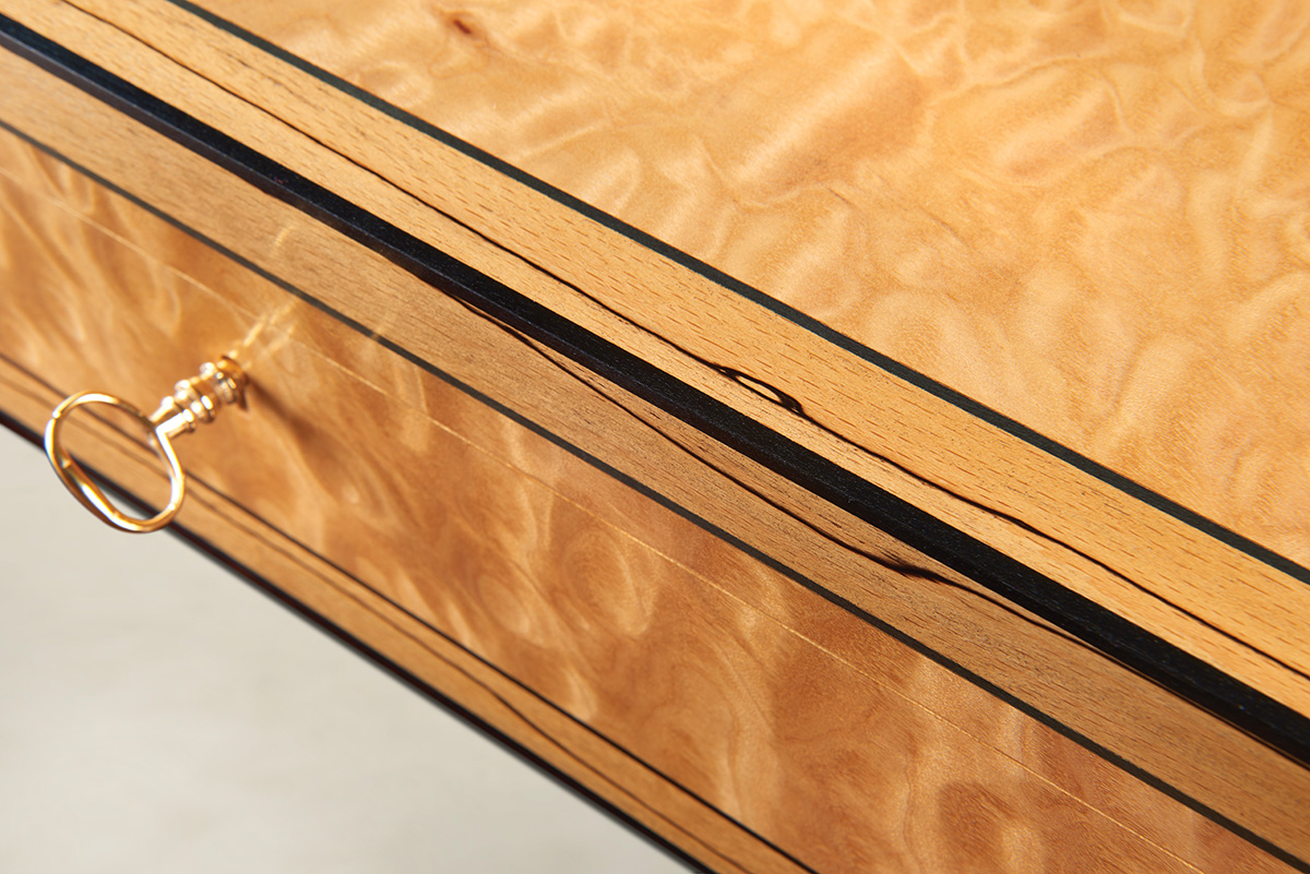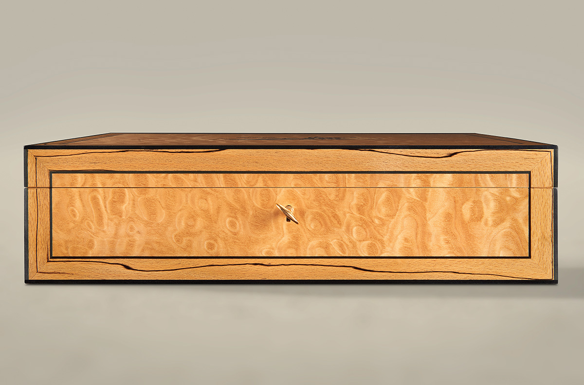 This striking quilted maple box with spalted beech banding and ebony stringing was created by Wheathills to house a luxurious Patek Philippe watch originally made in 1937. The design of the box perfectly reflects the flamboyant style of the period.
