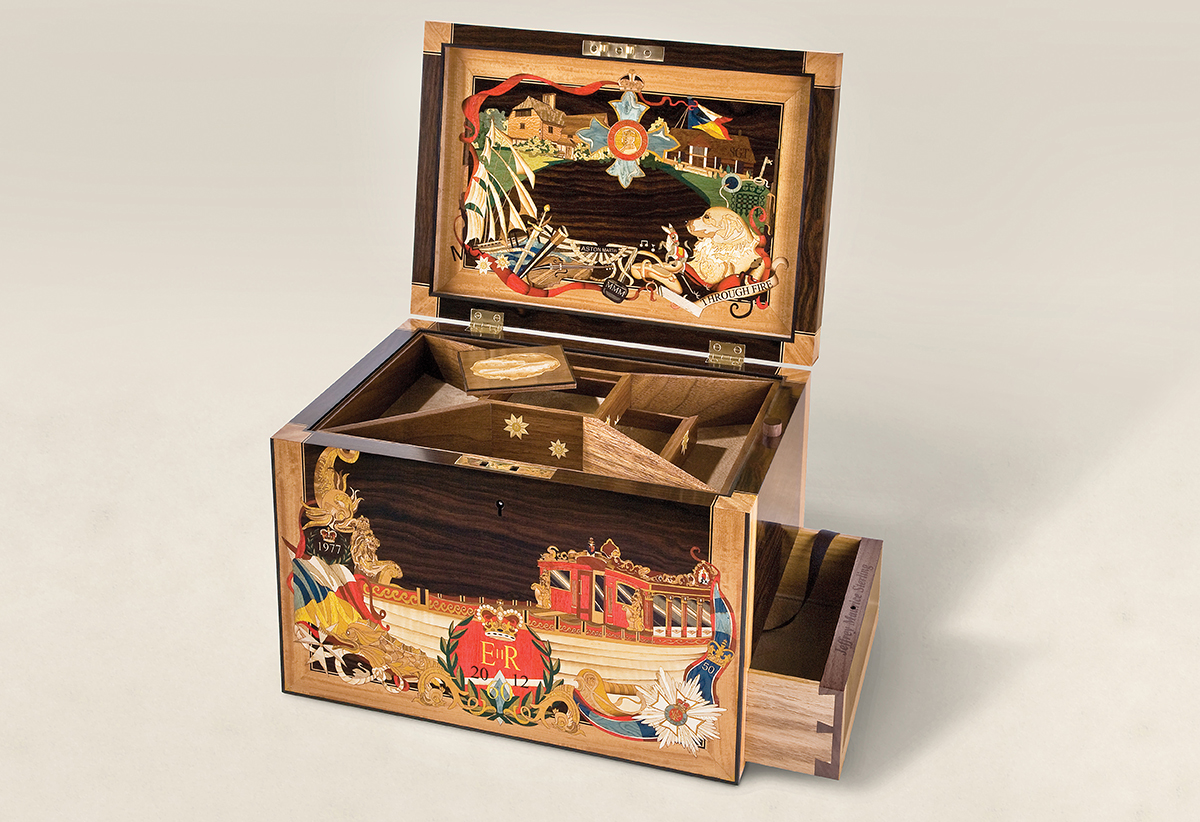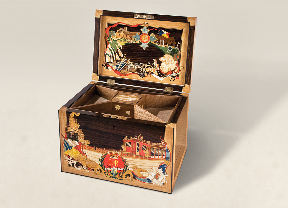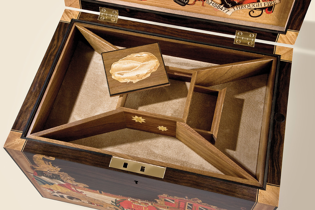 A memory box created in ziricote, banded to the edge in Indian satinwood, strung in ebony. The top is decorated with the Sterling coat of arms and the front is decorated with the history of royal service to which Lord Sterling was dedicated. The interior is decorated with symbols of personal achievements and family memories. The tray is decorated with a special moment and beneath is an open space adequate to keep safe A4 documents.