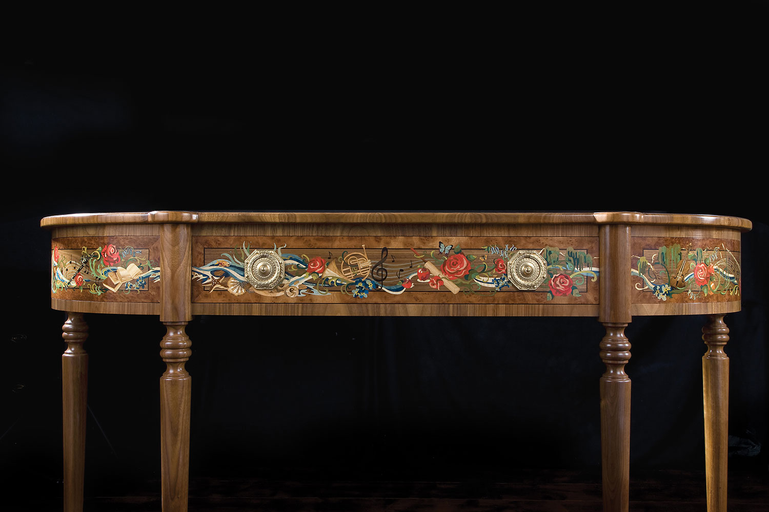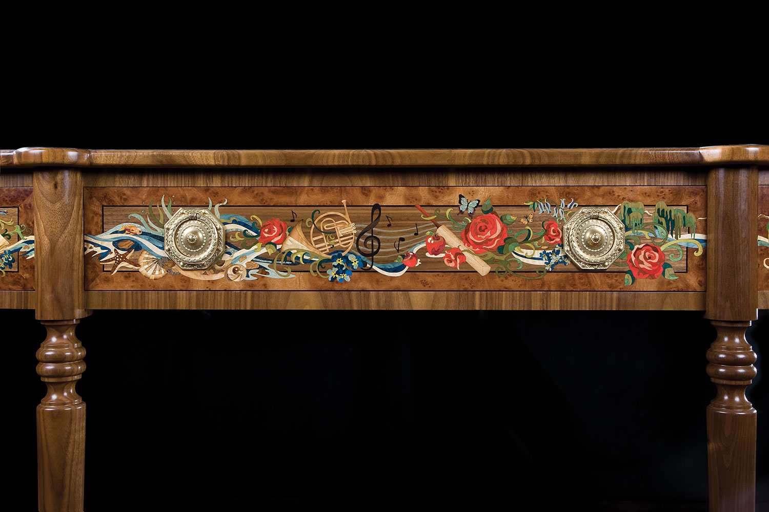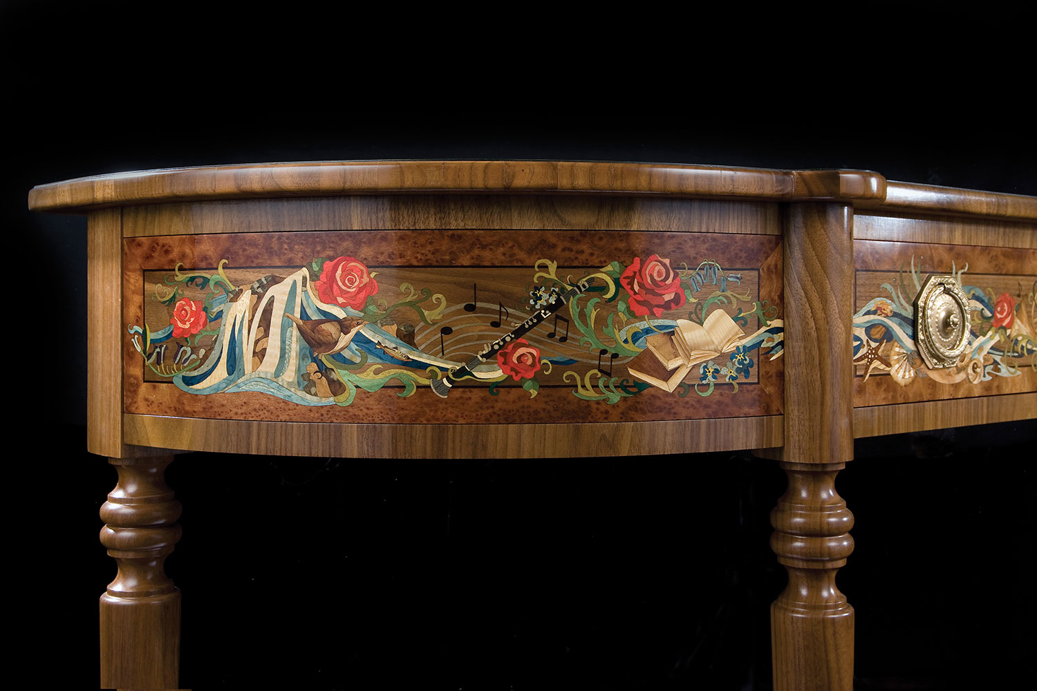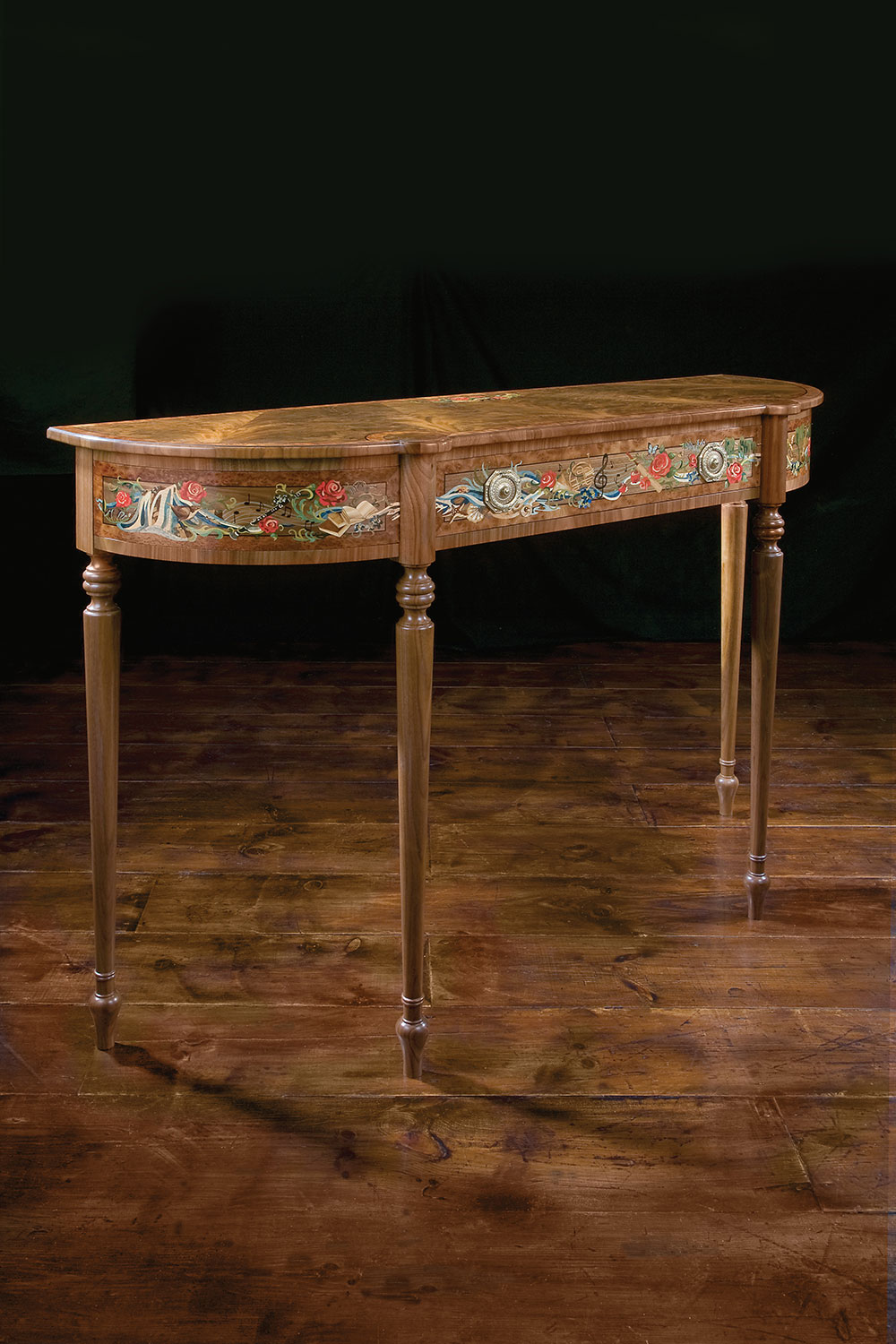 Created in D form the table top is veneered in flame walnut, banded to the edge in camphor and strung in ebony. Placed in centre of the back is a semi-circle of marquetry depicting sailing adventures in tropical seas and a quintessentially English game of cricket. The top is shaped to the coin front legs which are turned and tapered and are jointed to either side with a quadrant concealed drawer, flanking a central drawer decorated with marquetry depicting a love of music, literature, gardening and travel. The table is very shallow, narrow and tall giving elegant proportions. All is traditionally hand French polished to a silky smooth beeswax finish.