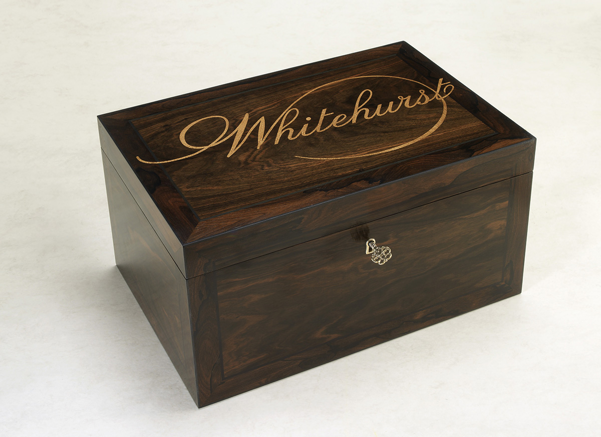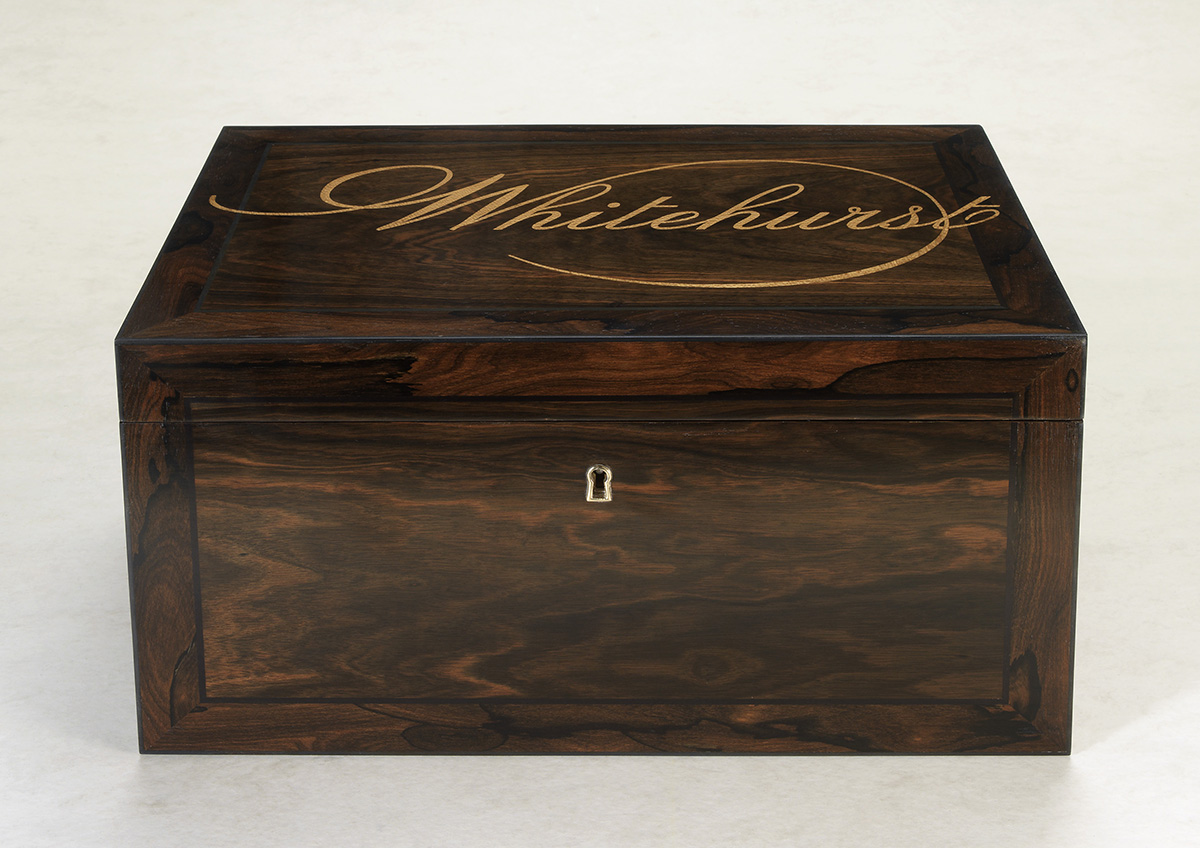 The Whitehurst name, which has been associated with precision and beauty by generations of clockmakers, is celebrated in inlaid marquetry on the box lid.