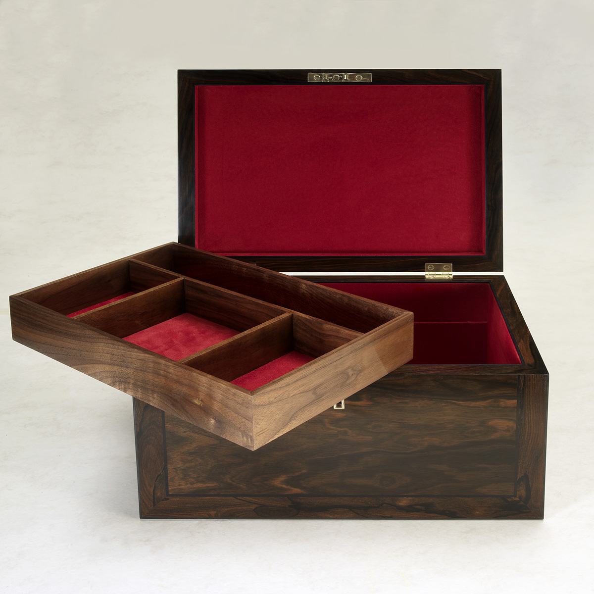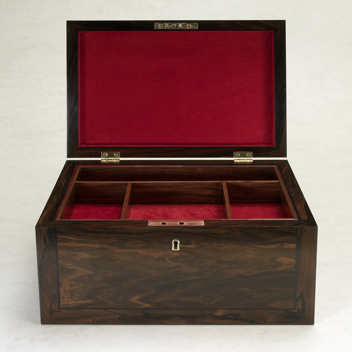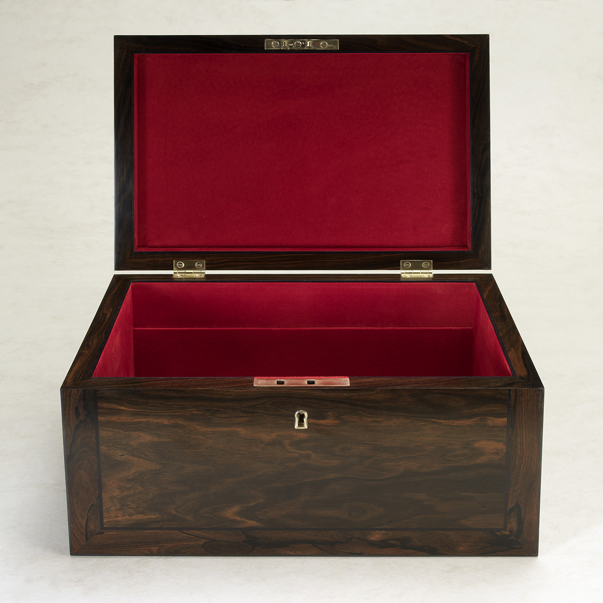 This ziricote presentation box, banded in makassar and strung throughout in ebony, was created to house items relating to the maintenance of a notable piece of furniture. It was given to accompany a Whitehurst grandfather clock and was designed to hold its key, gloves and clock maintenance tools.